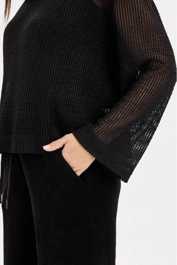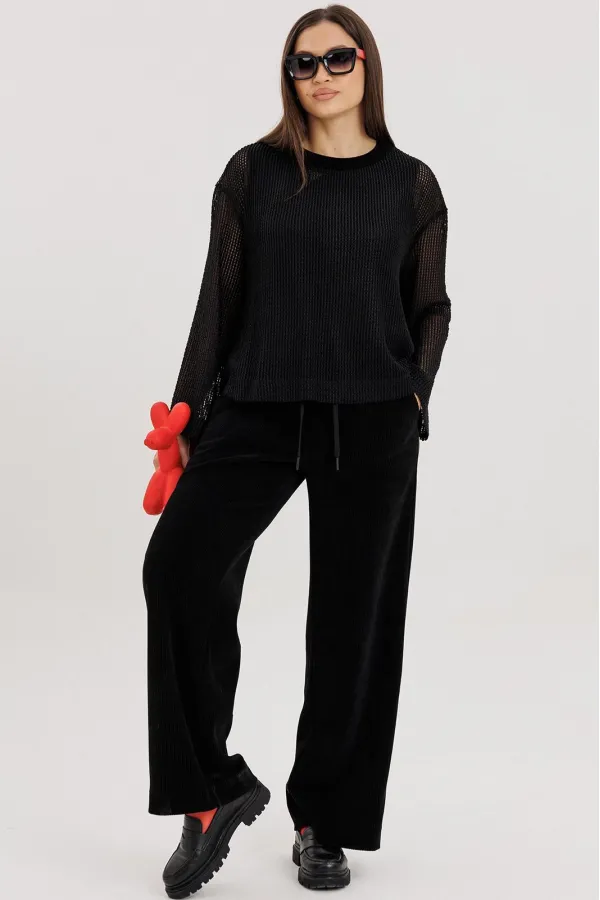 Рукав слегка расширенный к низу. Обтачка горловины из отделочного текстурного трикотажа.