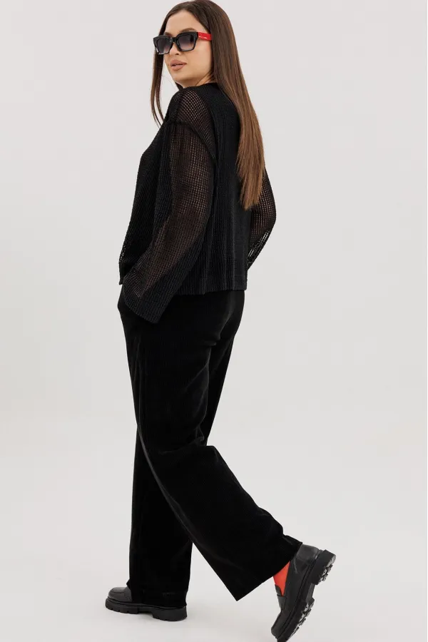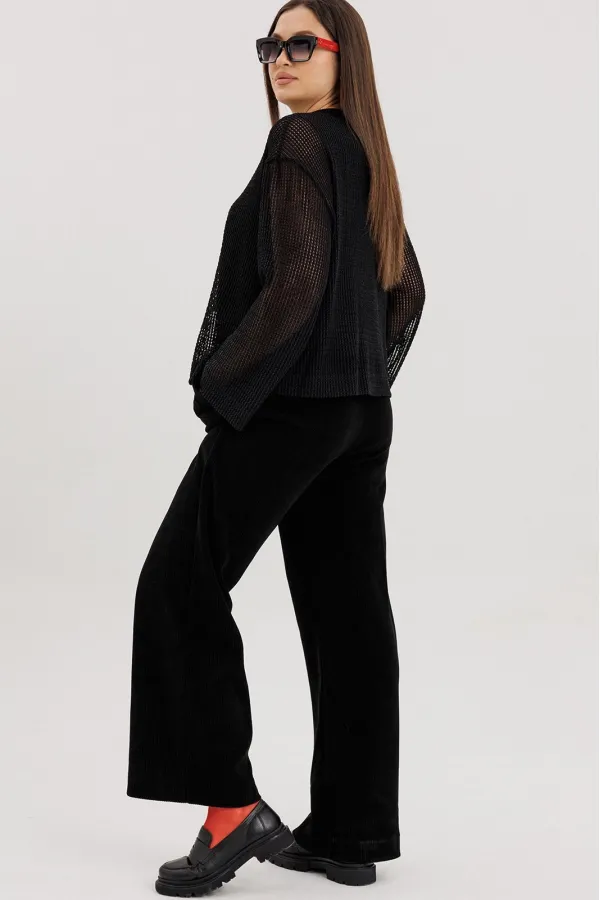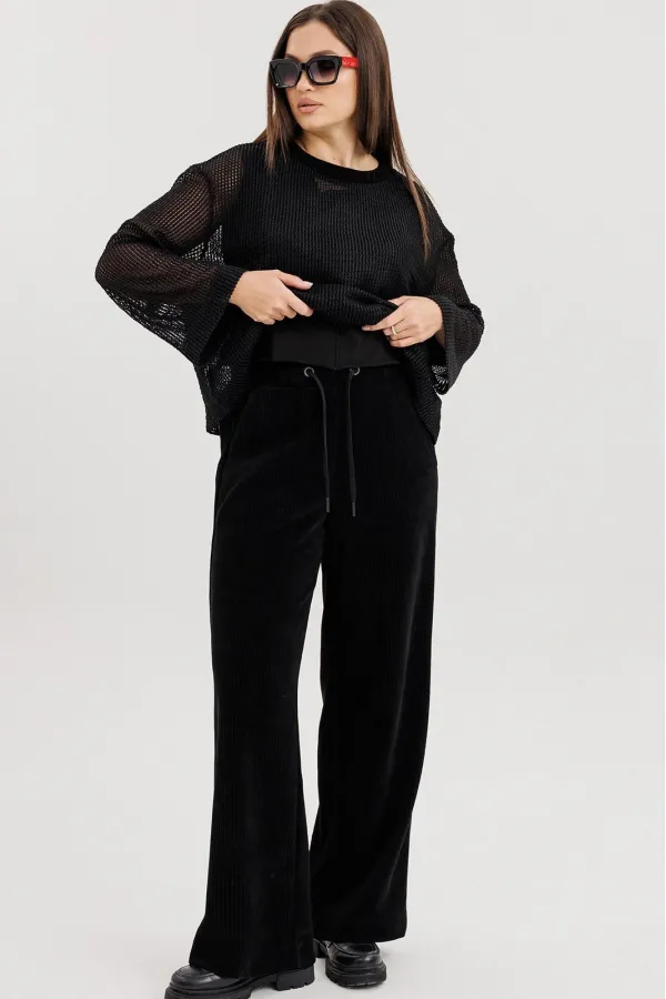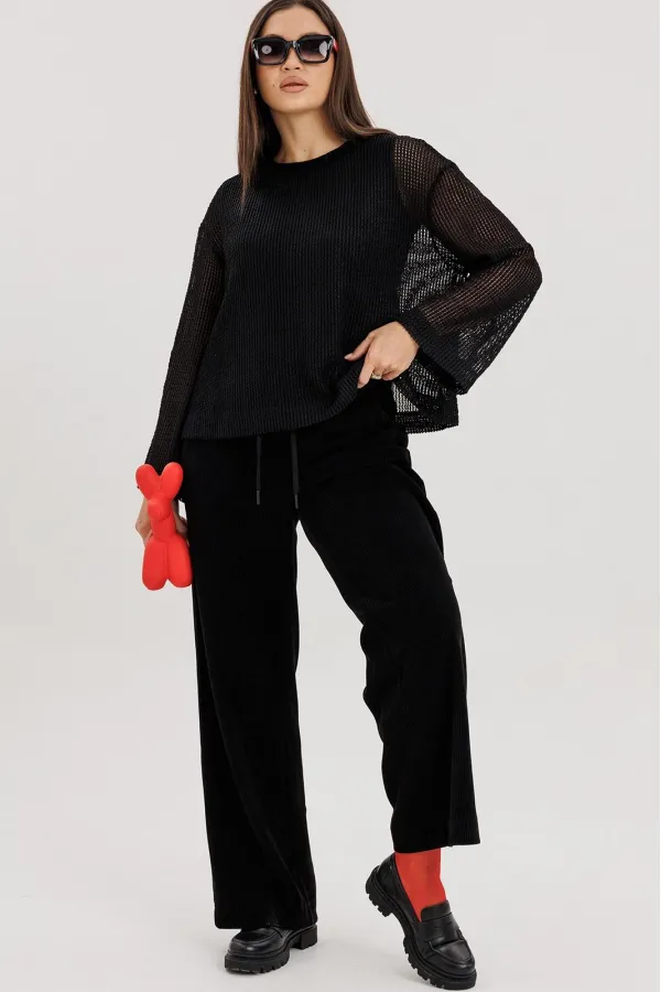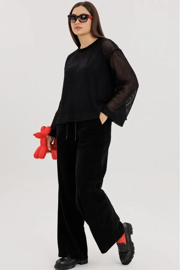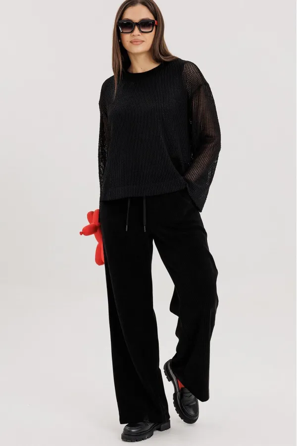 Брюки свободные, в расслабленном стиле, на притачном эластичном поясе с люверсами и отделочным шнуром-кулисой. По боковым швам - наклонные карманы.