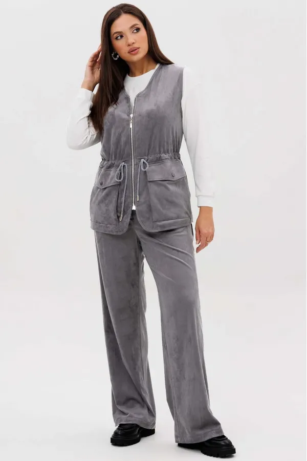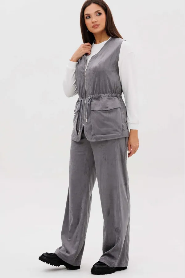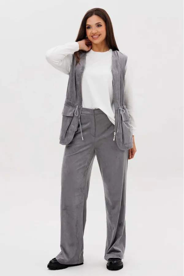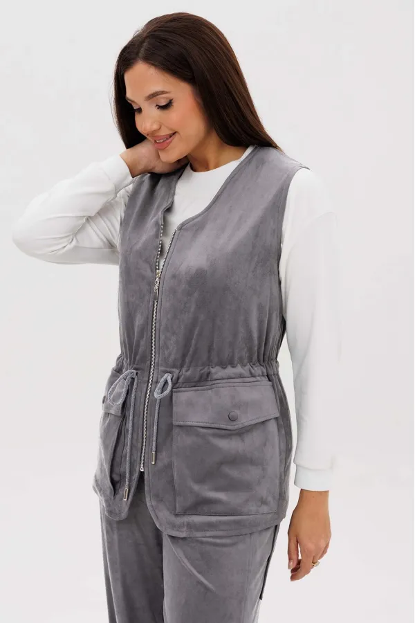Образ, который говорит сам за себя, смелый и дерзкий, и в то же время очень комфортный. Нестандартный жилет с накладными карманами-пеналами с клапаном. Регулирующая кулиса, подчеркивающая талию. Свободный силуэт, центральная застежка на тесьму молнию, фигурная линия низа. Жилет на подкладке.