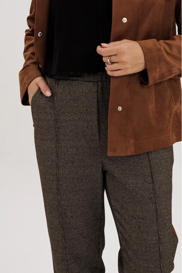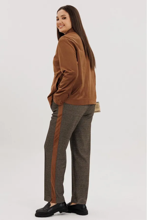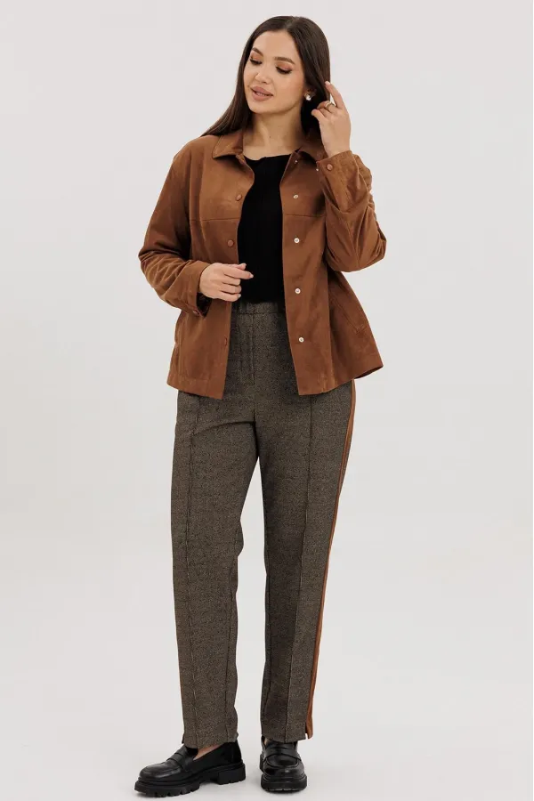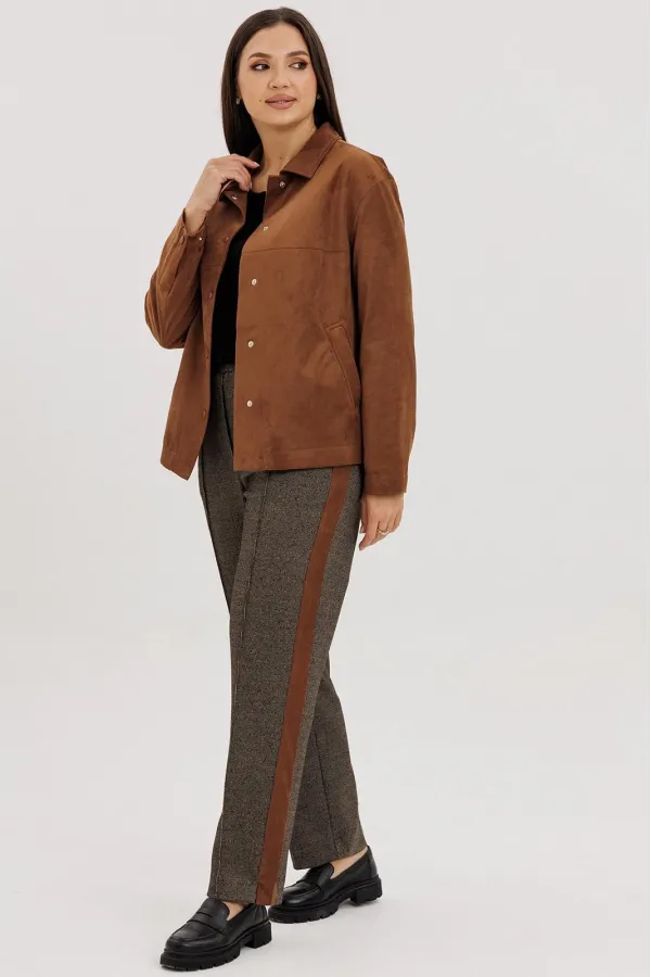 Стильный женский брючный костюм в стиле смарт-кэжуал сочетает комфорт и элегантность. Рубашка выполнена из замшевой ткани, брюки из трикотажа с декоративными замшевыми вставками. Идеальный выбор для офиса, деловых встреч и повседневных образов.