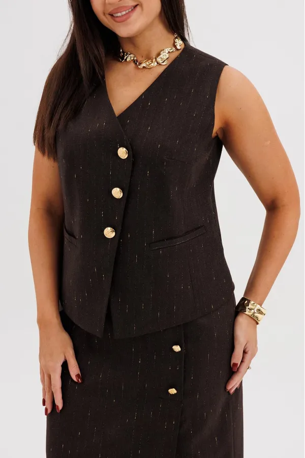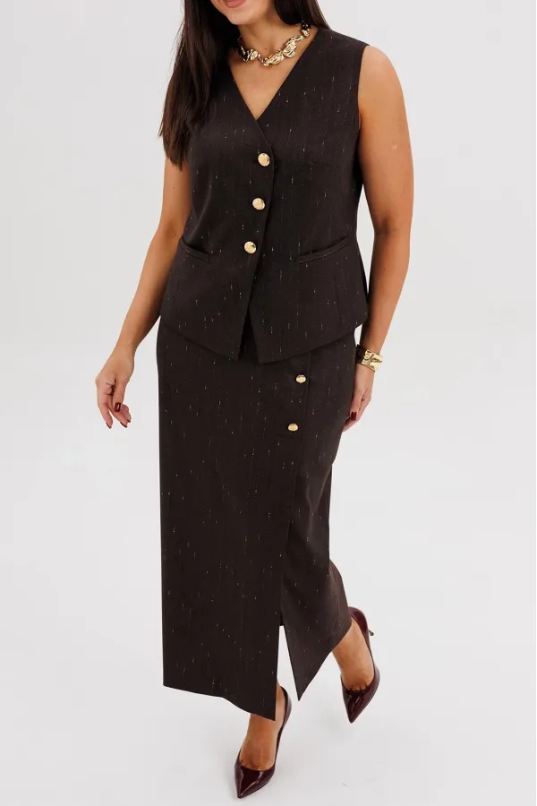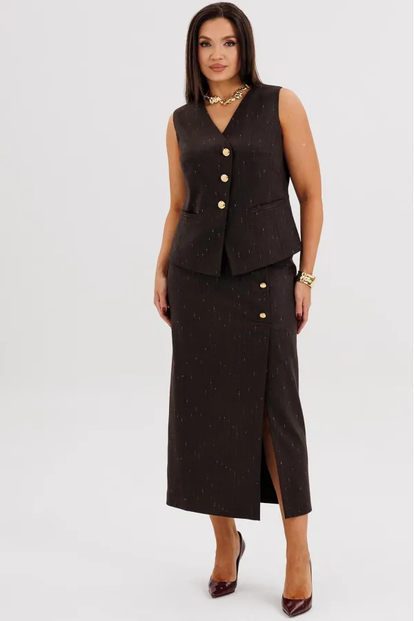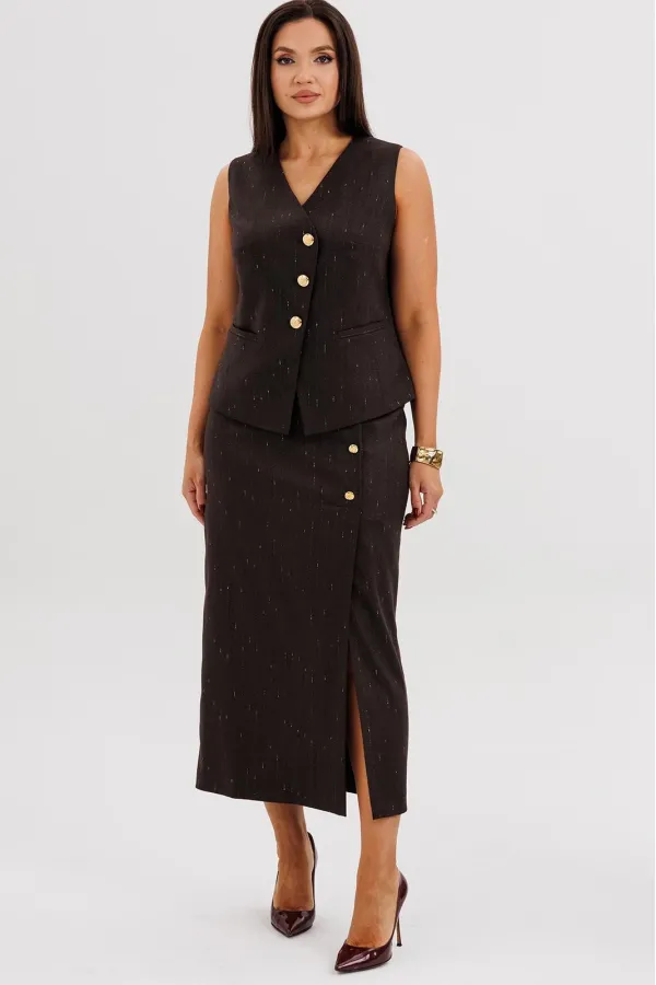 Жилет полуприлегающего силуэта подчёркивает линию талии и застёгивается на крупные декоративные пуговицы, создавая акцент на вертикали фигуры. Юбка миди с разрезом спереди и асимметричной застёжкой добавляет динамику и визуально удлиняет силуэт.
