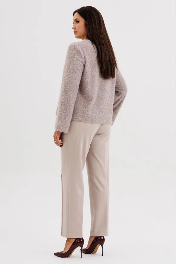 Блуза выполнена из нежного трикотажа с лёгким ворсом — материал красиво драпируется и придаёт образу уют. Брюки классического кроя с высокой посадкой и застроченными стрелками визуально вытягивают силуэт и создают безупречную посадку.