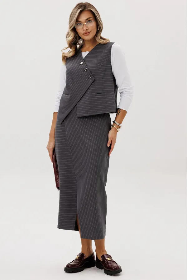 Стильный женский костюм в полоску — идеальное сочетание элегантности и современного минимализма. Комплект состоит из жилета оригинального кроя с асимметричной застёжкой, прямой юбки миди с мягким запахом и джемпера с длинным рукавом.