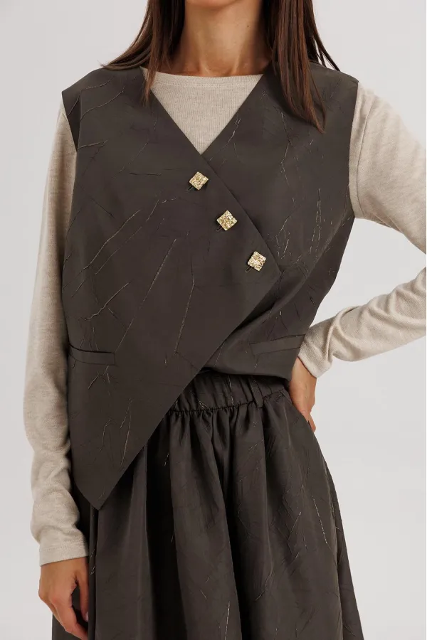 Асимметричная застёжка жилета на декоративные пуговицы.