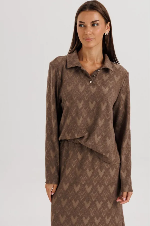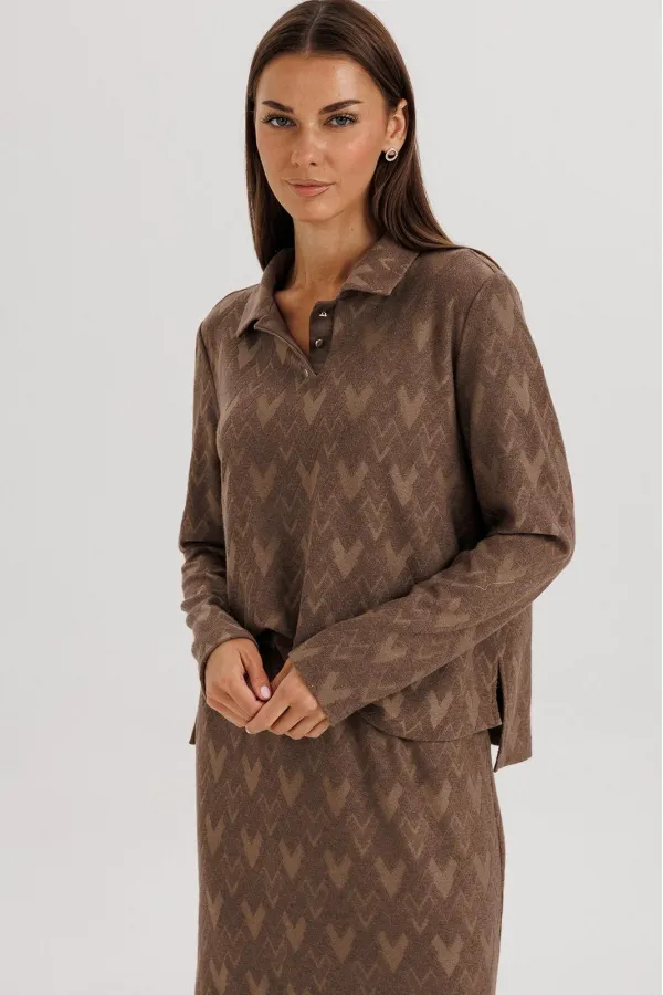 Джемпер-поло выполнен с длинным рукавом и отложным воротником, застёжка на несколько пуговиц добавляет спортивной нотки. Свободный крой создаёт расслабленный силуэт и ощущение уюта.