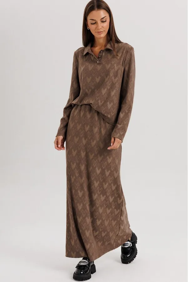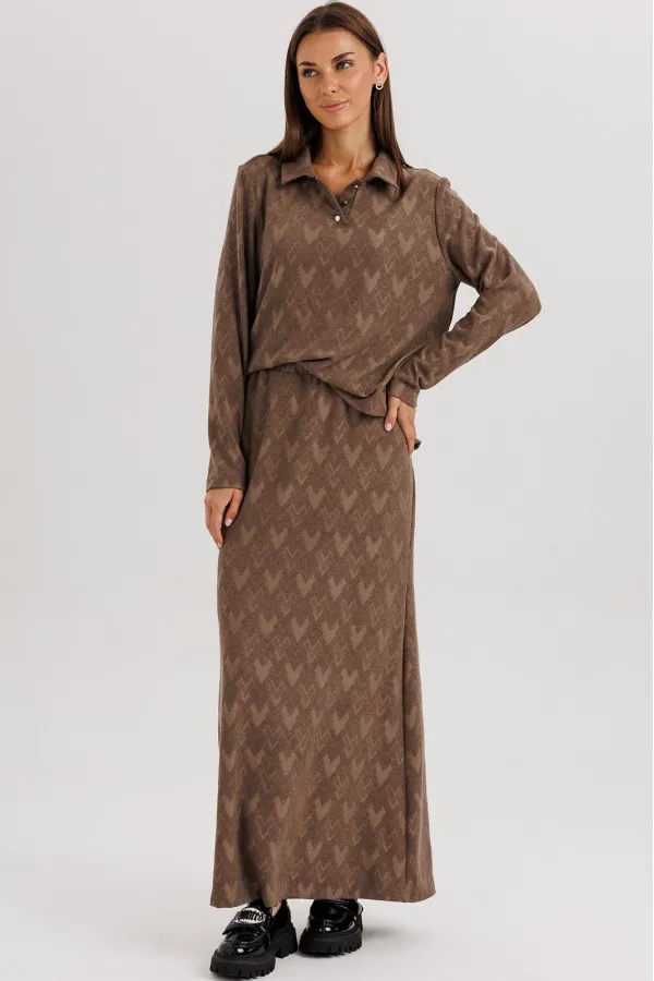 Это модный сет из мягкого трикотажа, включающий в себя джемпер-поло и юбку-«рыбку».
