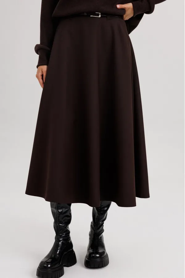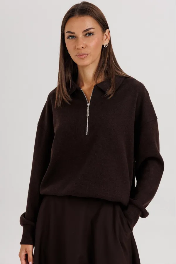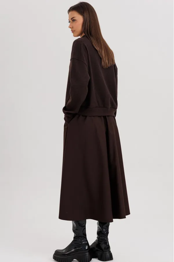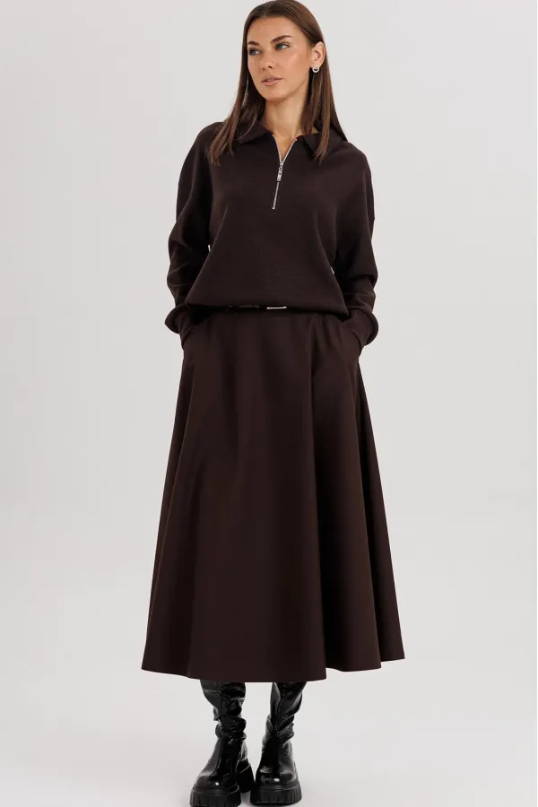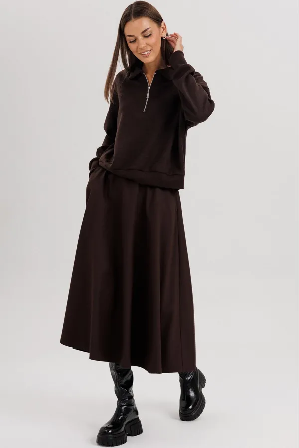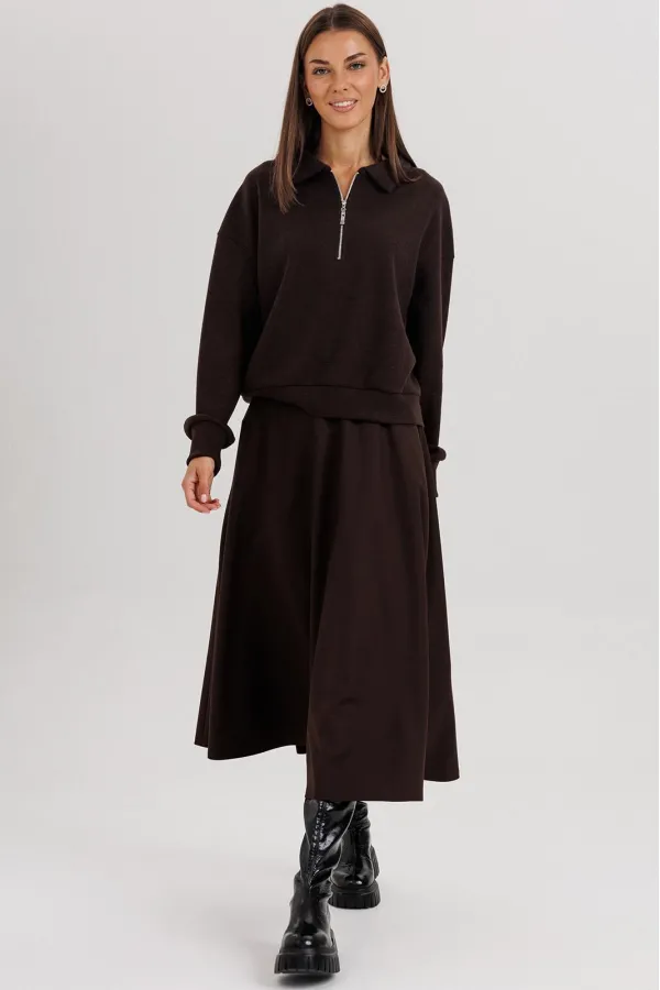 Джемпер из трикотажа. Это одна из базовых вещей осенне-зимнего сезона. Он тёплый, удобный и невероятно комфортный. К тому же, настолько универсален, что его можно стилизовать абсолютно разными способами. Свободный покрой с заниженной линией плеча, рукав рубашечного покроя на отрезной манжете, воротник классический, по центру полочки частичная застёжка-молния. По низу джемпера - отрезной пояс. Юбка коническая, длины миди на притачном поясе, частично эластичном в области спинки. По боковым швам - наклонные карманы, застёжка по центру заднего полотнища на тесьму-молнию и петлю пуговицу. Пояс в комплект не входит. Длина юбки около 72 см.