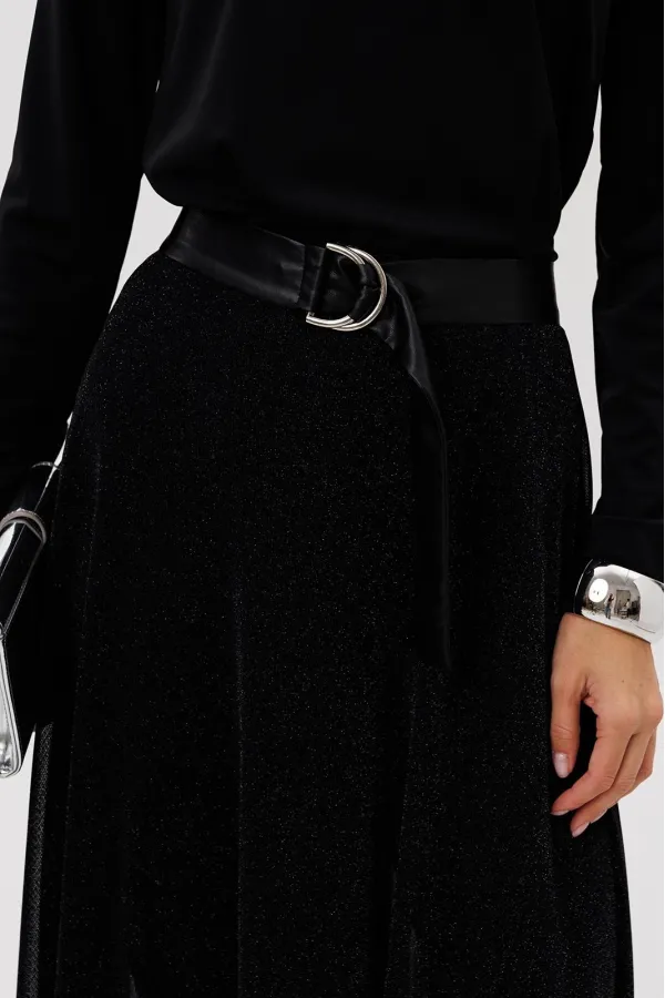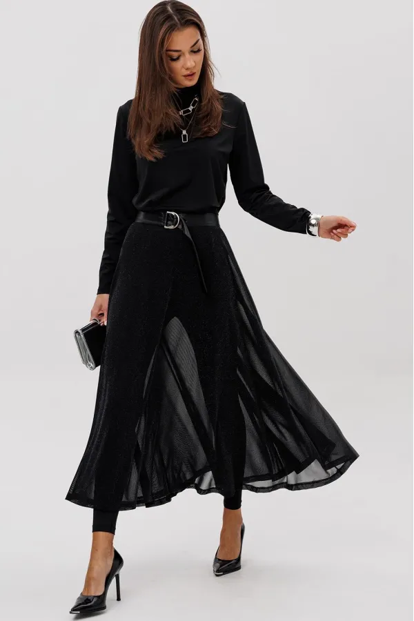 Юбка выполнена из воздушной мерцающей сетки, которая красиво ловит свет при каждом движении, создавая по-настоящему нарядное, торжественное настроение. Лёгкое сияние ткани добавляет образу утончённости, а отделочный пояс из экокожи акцентирует талию и придаёт современной графичности.