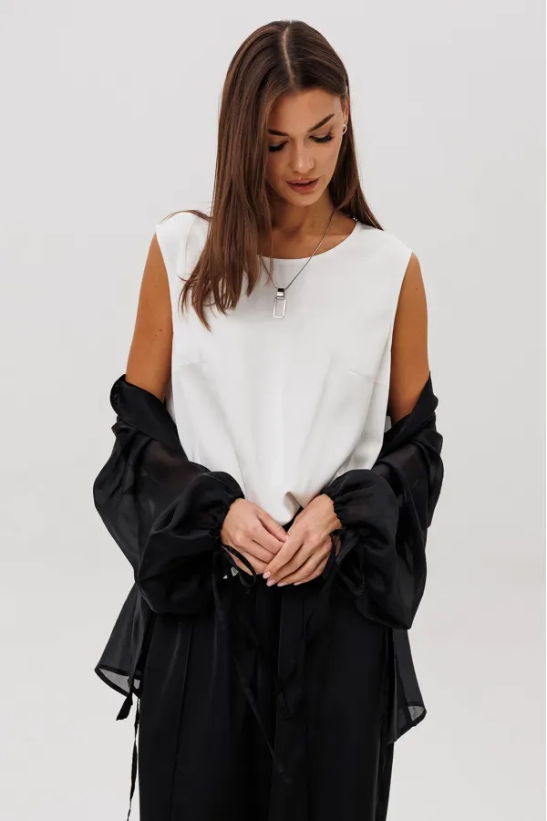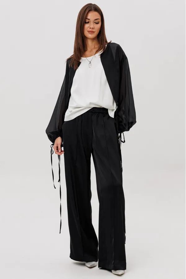 Эффектный ансамбль-тройка, в котором каждая деталь работает на утончённый и современный образ. Полупрозрачный блузон из воздушной вискозной органзы создаёт легкую дымку и добавляет образу благородной загадочности, а акцентные завязки подчёркивают талию и делают силуэт более выразительным. Контрастный атласный топ вносит нотку сияния и гармонично освежает тёмную гамму комплекта. Широкие атласные брюки со стрелкой и комфортным эластичным поясом добавляют образу сдержанной элегантности и подчёркивают его продуманную роскошность.