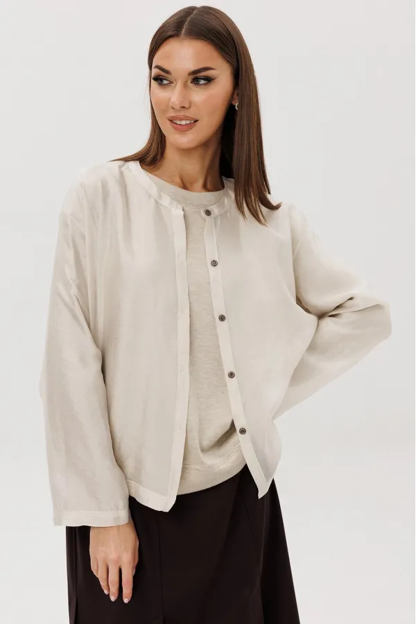Финальный штрих — невероятно нежная блуза из тонкой вискозной органзы. Полупрозрачная, воздушная, она добавляет образу утончённый шарм и лёгкий эффект многослойности, который выглядит по-настоящему современно и статусно.