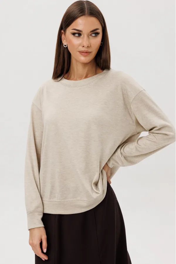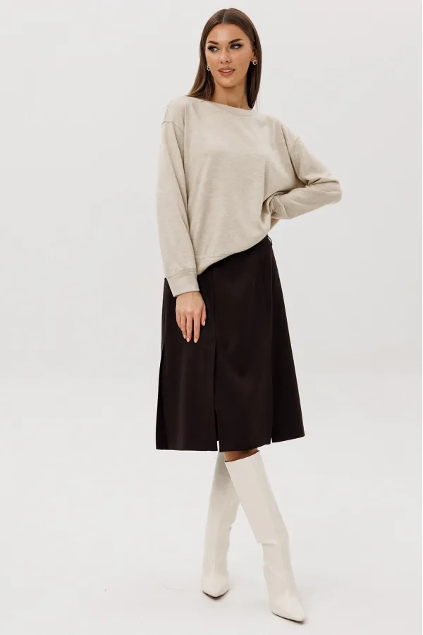 К ней идеально подходит трикотажный джемпер из мягкого смешанного полотна с шерстью — комфортный, тёплый и благородно текстурный. Он создаёт аккуратный, дорогой объём и мягко обнимает фигуру, обеспечивая комфорт в течение всего дня.
