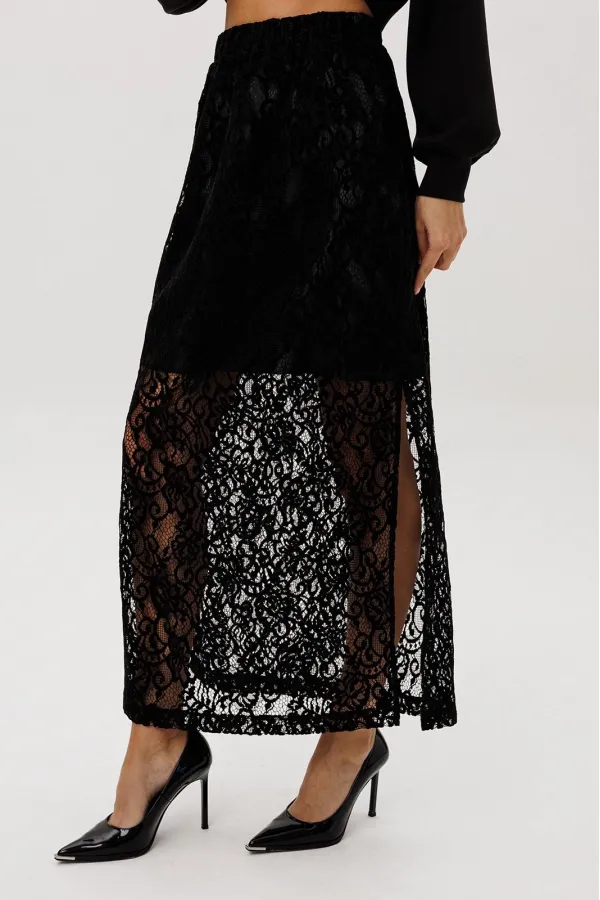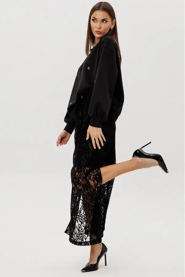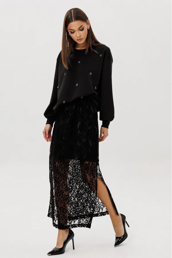 Стильный комплект, сочетающий уют и женственность. Мягкий свитшот из комфортного трикотажа украшен ручной расшивкой декоративными элементами в форме «клевера» — утончённая деталь, создающая акцент на естественной элегантности. Юбка выполнена из трендового шенилового гипюра с укороченной подкладкой, что придаёт образу лёгкость и современную многослойность.