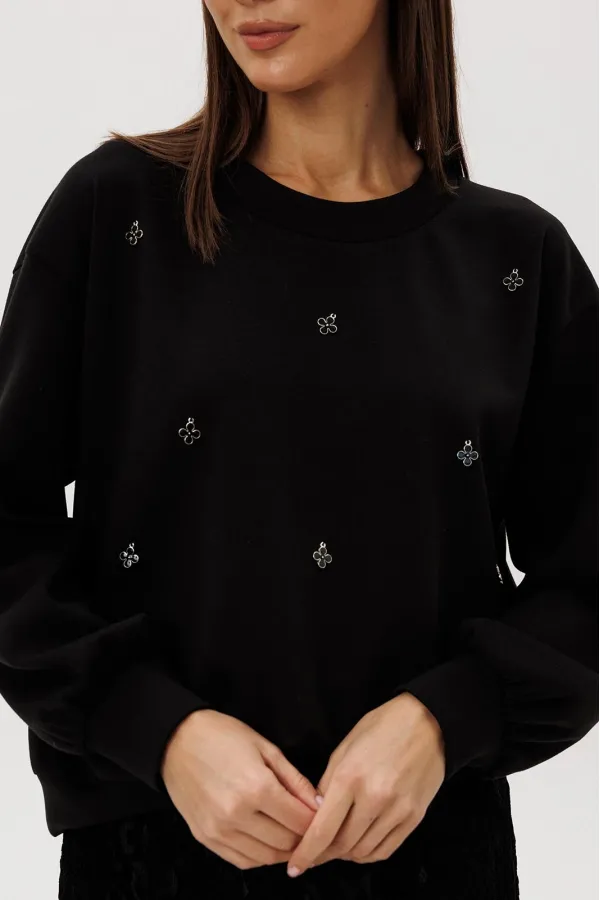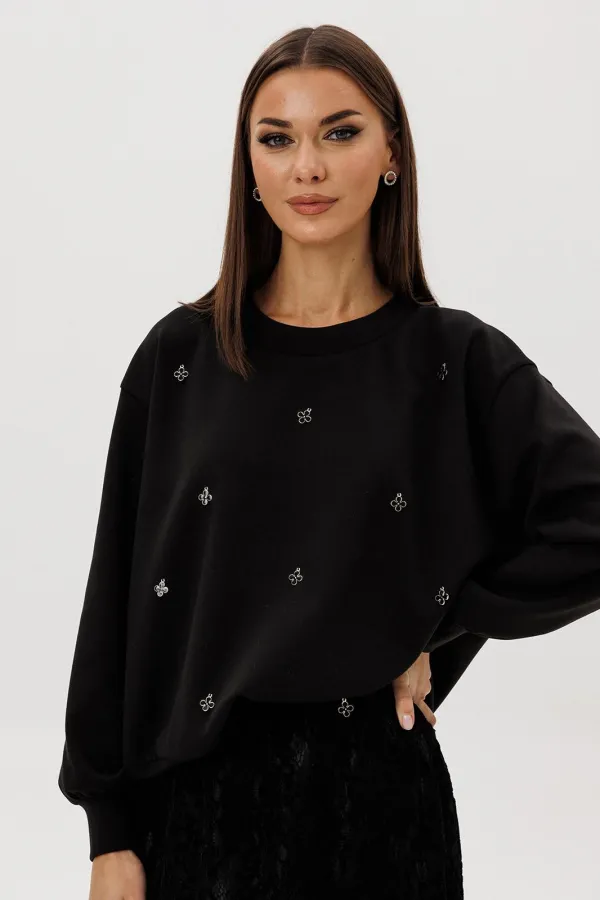 Стильный комплект, сочетающий уют и женственность. Мягкий свитшот из комфортного трикотажа украшен ручной расшивкой декоративными элементами в форме «клевера» — утончённая деталь, создающая акцент на естественной элегант... Читать далее...
