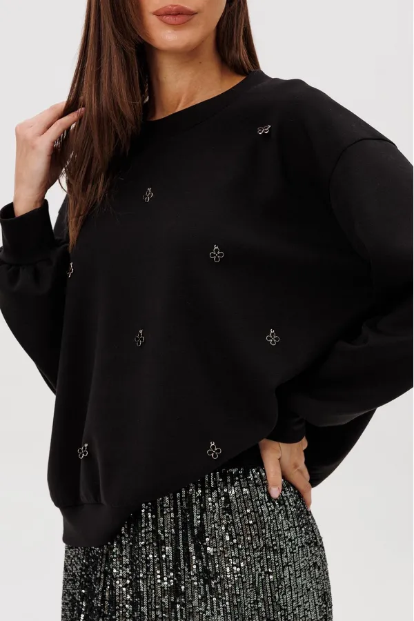 Стильный комплект, сочетающий уют и женственность. Мягкий свитшот из комфортного трикотажа украшен ручной расшивкой декоративными элементами в форме «клевера» — утончённая деталь, создающая акцент на естественной элегант... Читать далее...