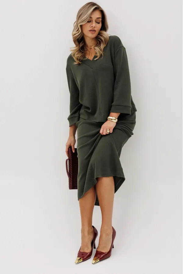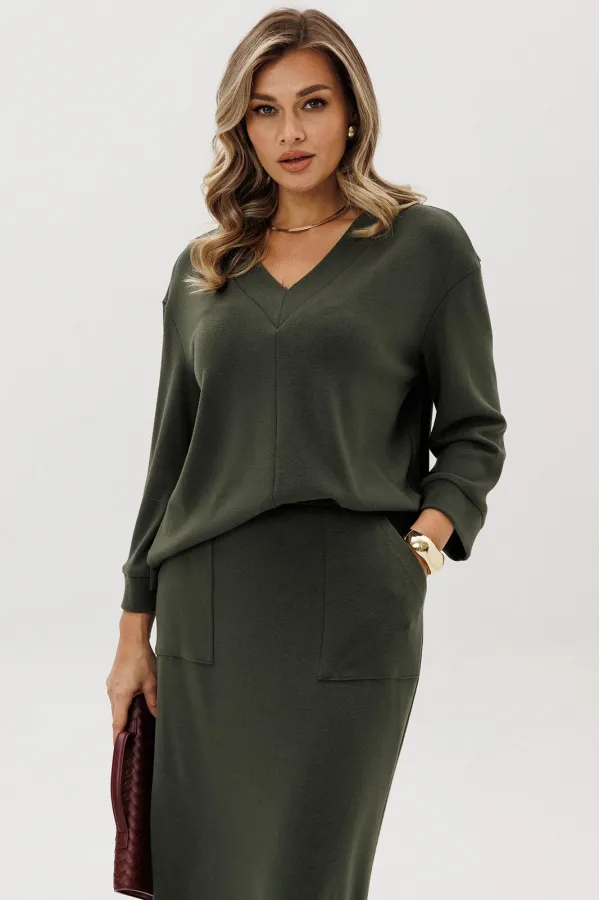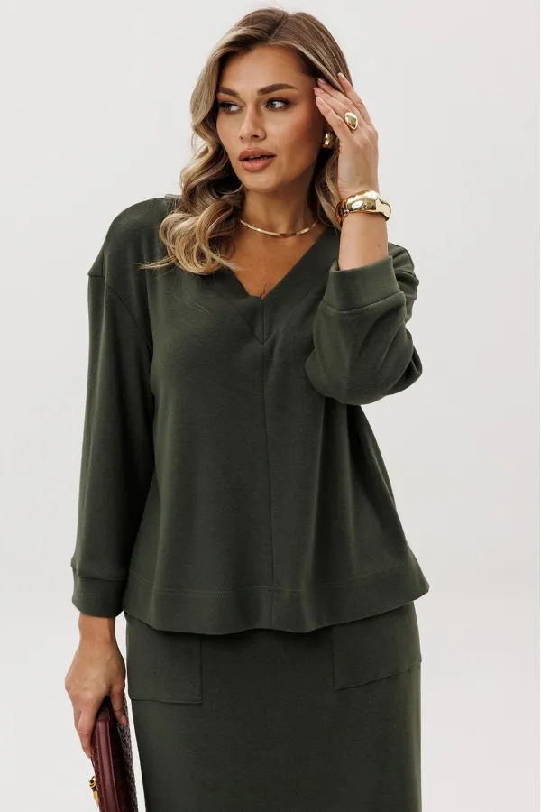 Свободный упрямлённый джемпер с заниженной линией плеча, V-образным вырезом и рукавом длиной 7/8. По горловине и низкам рукавов - отделочные полоски.