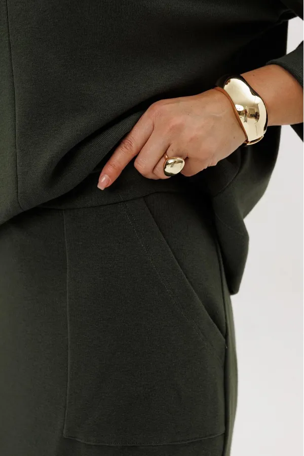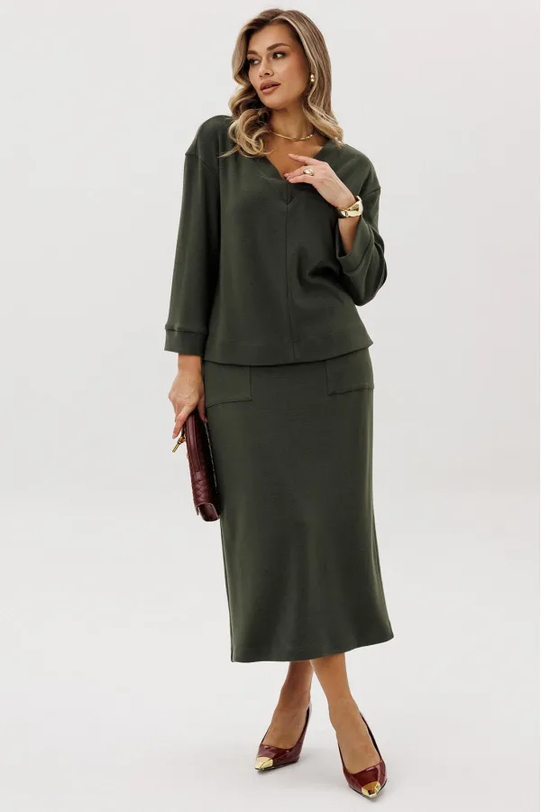 Юбка макси, на притачном эластичном поясе с большими накладными карманами на переднем полотнище. Заднее полотнище с центральным швом, шлицей, талиевыми вытачками и застёжкой.