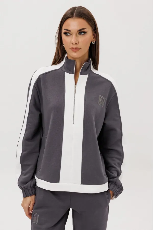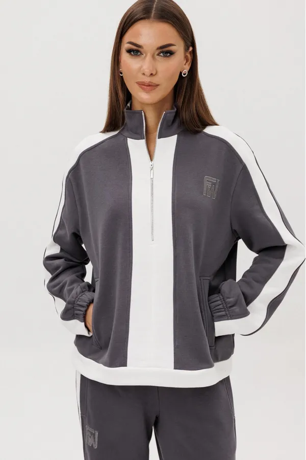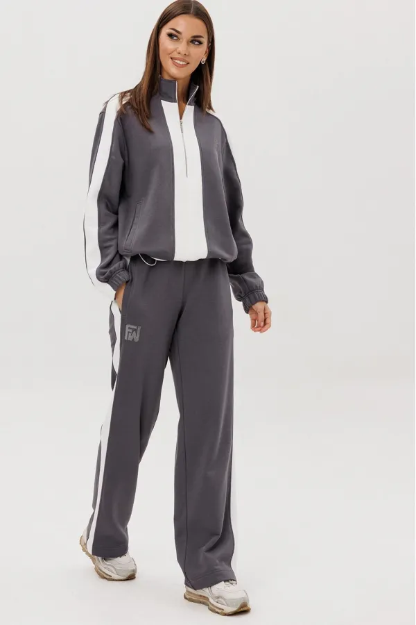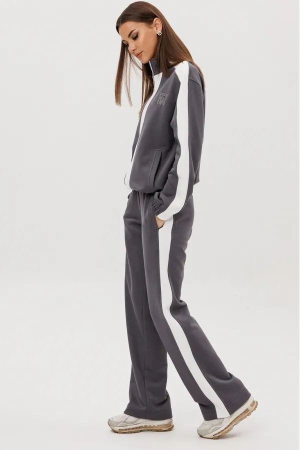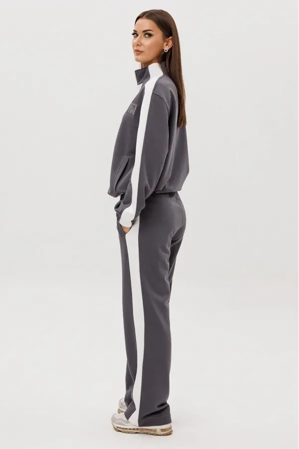 Контрастные лампасы на брюках, рукавах, по центру переда и низу придают модели особую динамичность и изысканность.