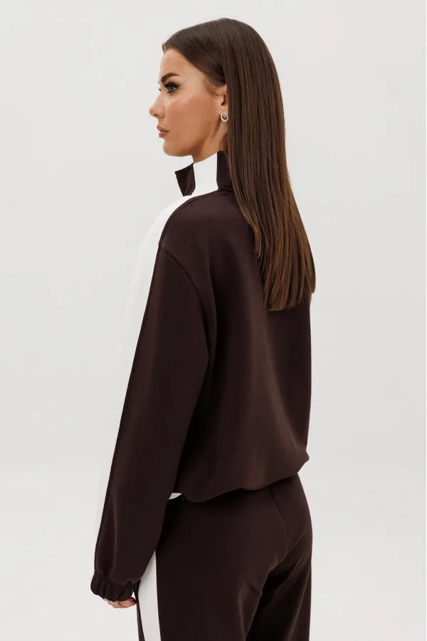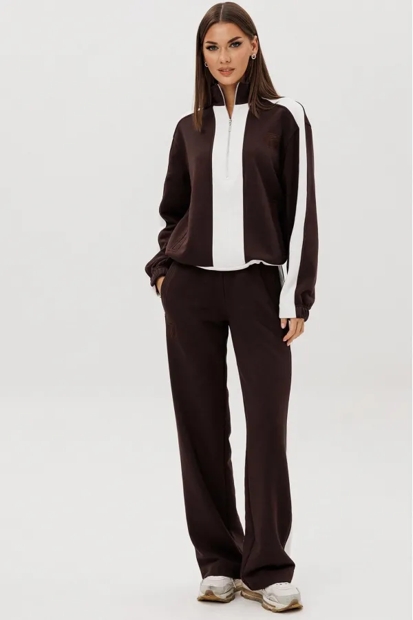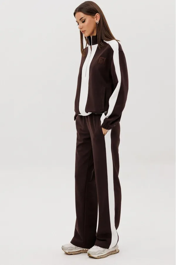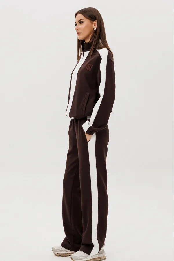 Контрастные лампасы на брюках, рукавах, по центру переда и низу придают модели особую динамичность и изысканность.