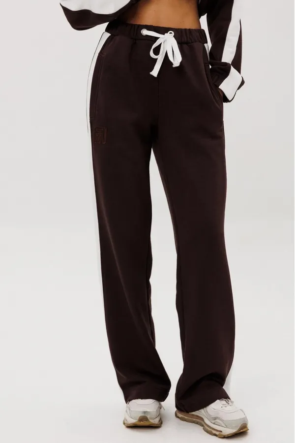 Брюки свободные, прямые на притачном эластичном поясе с контрастными лампасами и карманами с листочками в боковых швах.