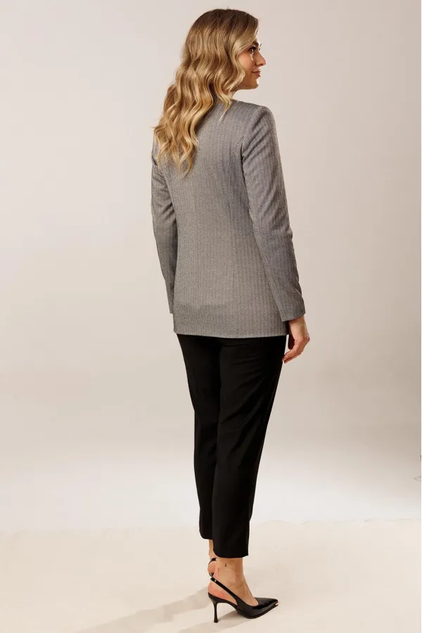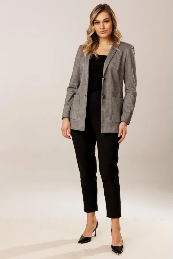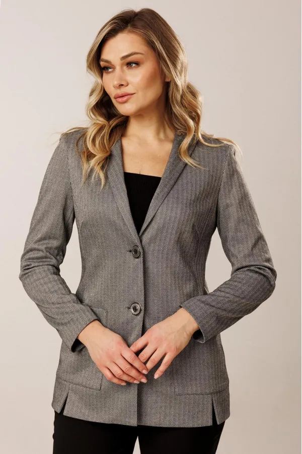 Жакет на подкладке, с накладными карманами и фигурными разрезами по переду. Застежка на петли и пуговицы. Спинка с центральным швом и притачными бочками.
