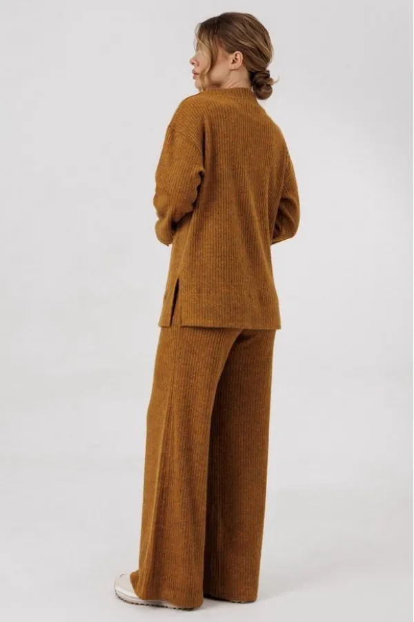 разрезами в боковых швах. Брюки широкие, на резинке, с карманами.
