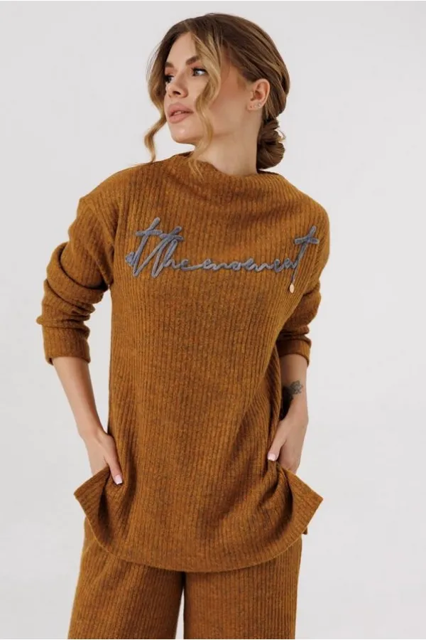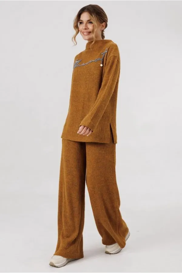Комплект состоит из джемпера и брюк. Джемперсвободного силуэта, с дизайнерской объемной вышивкой по полочке иразрезами в боковых швах. Брюки широкие, на резинке, с карманами.... Читать далее...