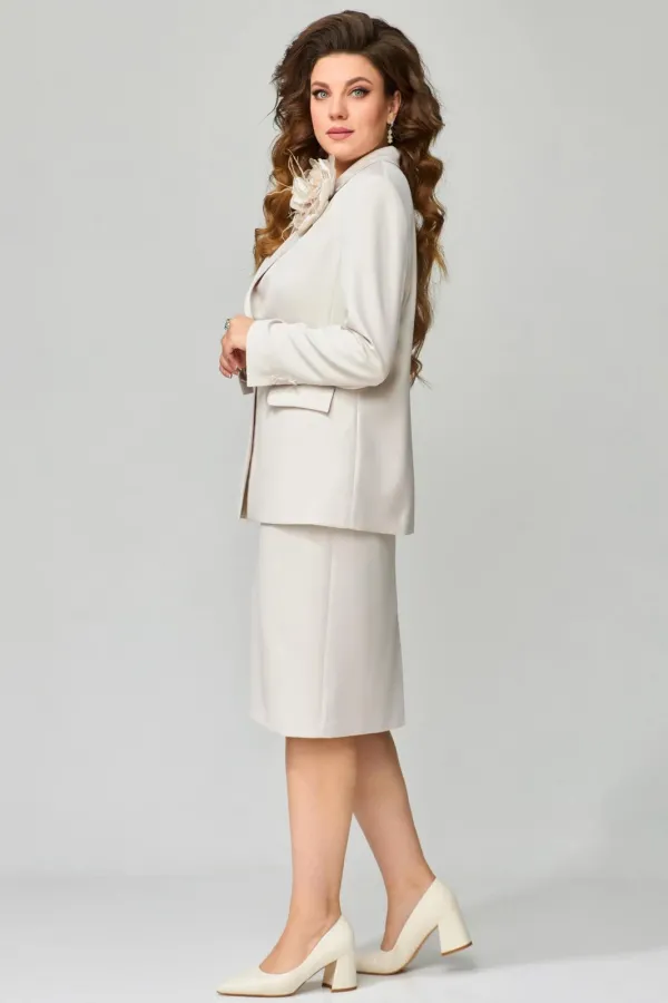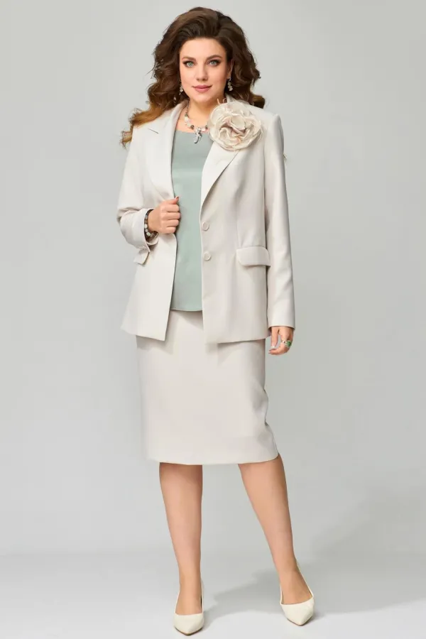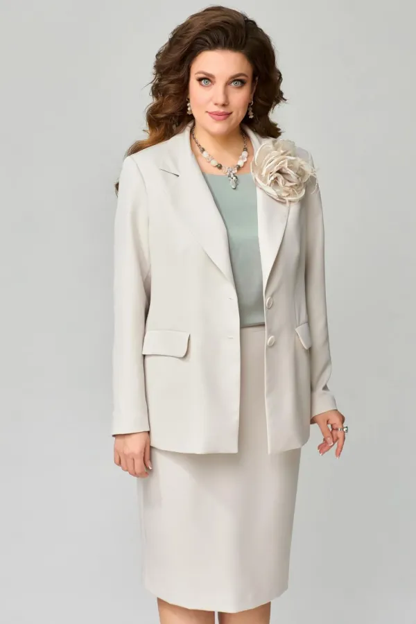 Классический юбочный костюм Велина прямого силуэта, жакет и юбка на подкладке. Отлично подойдет для торжественных выходов и праздников. В жакете прорезной карман с клапаном, застежка однобортная с лацканами, рукав двух шовный с закрытой шлицей и с пуговицами. По спинке изделия идет средний шов. Юбка зауженная к низу, по спинке юбки - шлица, на поясе по бокам резинка, застежка на потайную молнию и пуговицу. Блузка без рукав, с овальным вырезом по горловине, проймы и горловина обработаны обтачкой, них блузки обработан московским швом. Цветок ручной работы входит в комплект.