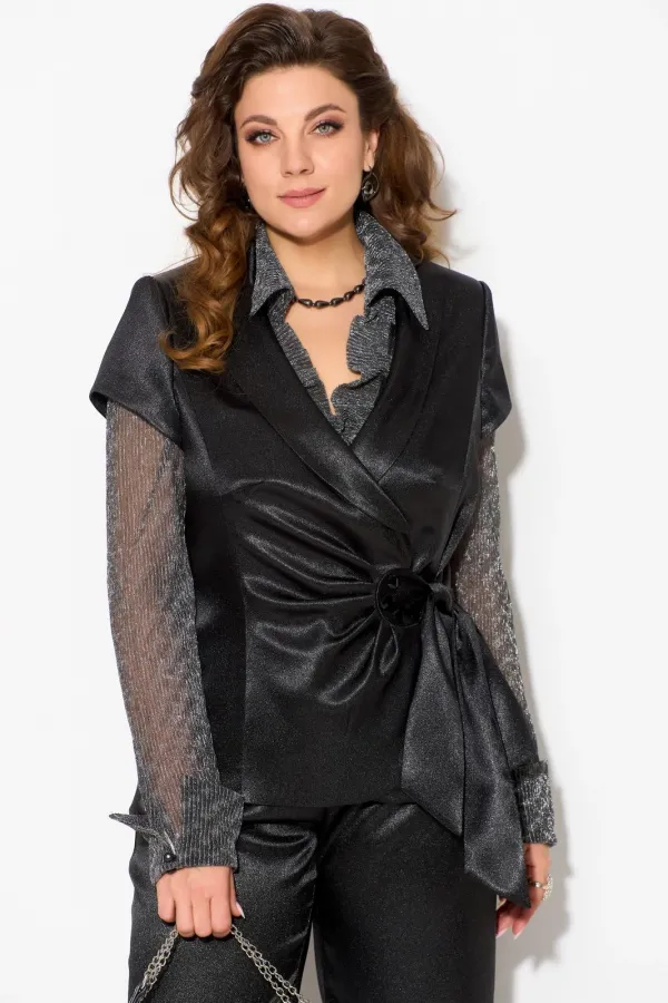 Блузка нарядная, прилегающего силуэта, выполнена из жатой сетки. По горловине полочки рюша. В рюшу вставлен шнур. Застежка однобортная на навесные петли и пуговицы. Воротник отложной, на стойке, рубашечного типа. Рукав втачной, по низу рукава отложной манжет с застежкой на навесные петли и пуговицы.