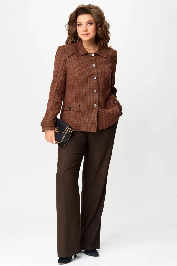 Жакет — как картина, написанная в клетку, где каждая линия — это штрих характера. Выполненный из текстильной ткани с подкладкой, он обнимает фигуру полуприлегающим силуэтом, подчеркивая осанку и уверенность. Однобортная застежка на петли и пуговицы — классическая, но с современным акцентом. Отложной воротник добавляет интеллигентности, а кокетка с декоративным кантом — изысканную графику, словно тонкая рамка на портрете. Нагрудная выточка и отрезной бочок формируют изящный рельеф, а накладные карманы с клапанами — функциональные и стильные, как детали винтажного чемодана. Спинка с кокеткой и средним швом — завершение композиции, где каждая строчка — как линия судьбы. Рукава — двухшовные, втачные, с декоративной патой на манжете — это штрих, который делает образ завершённым и продуманным.