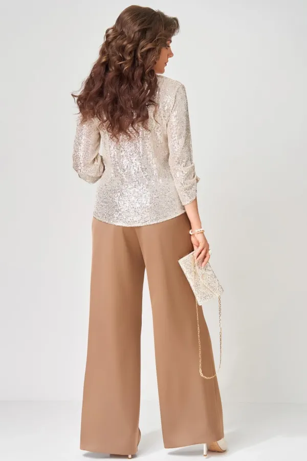Нарядный комплект Зария состоит из нарядной блузки, сатиновых нарядных брюк и сумки-клатча. Нарядная блузка выполнена из мягкой трикотажной сетки в пайетки. Блузка полуприлегающего силуэта с драпировкой по полочке. Горло... Читать далее...