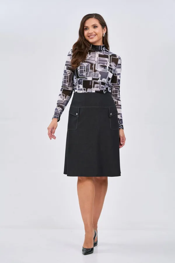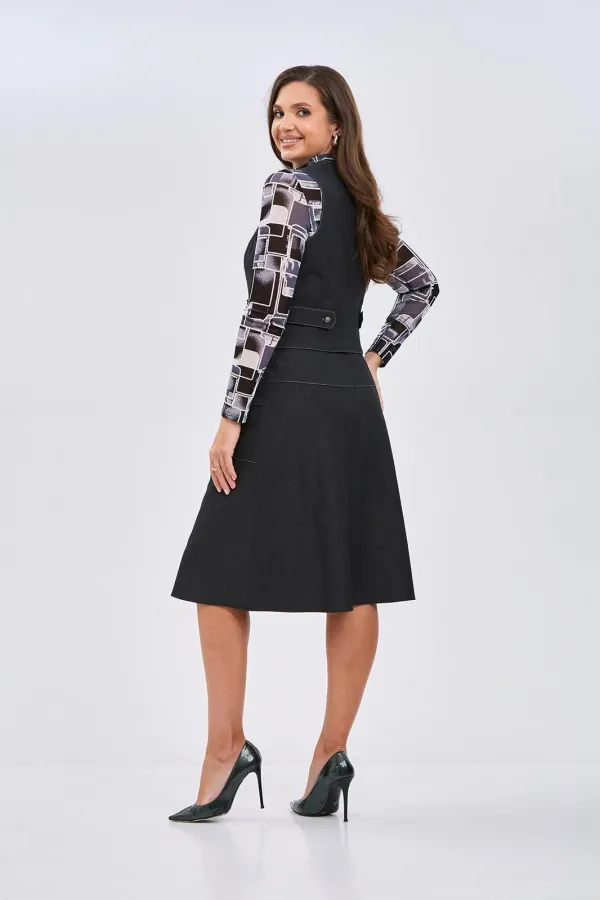 Костюм женский, тройка. Состоит из юбки, жилета на подкладке, а так же гольфа из трикотажа- сетки. Жилет по переду и спинке с рельефными швами и застёжкой на петли-пуговицы. Спинка жилета по бокам имеет паты с пуговицей.... Читать далее...