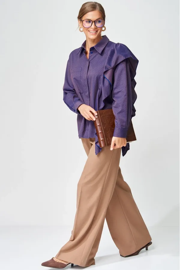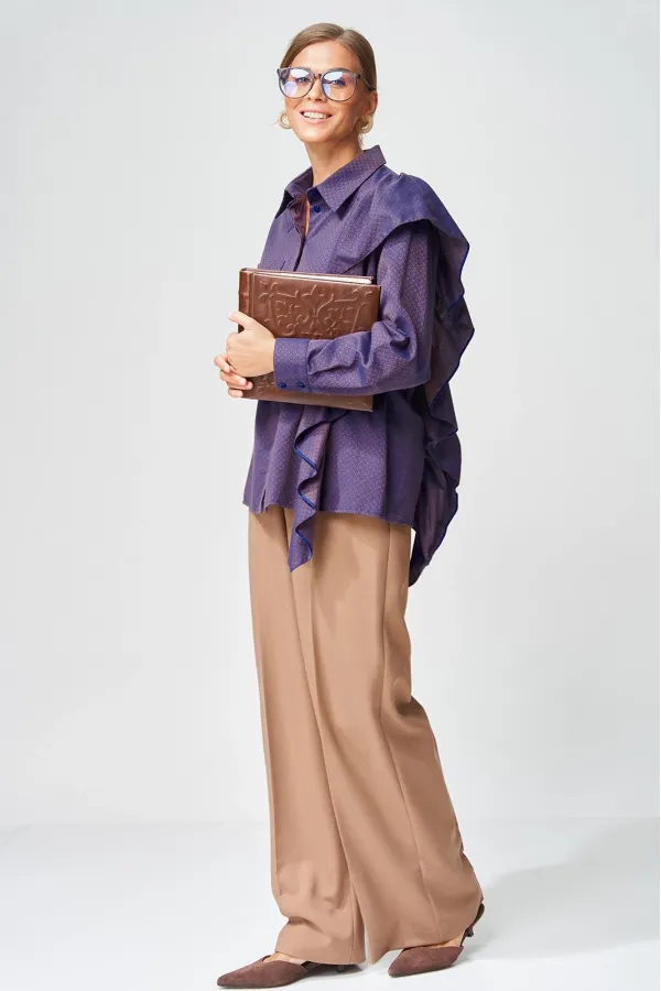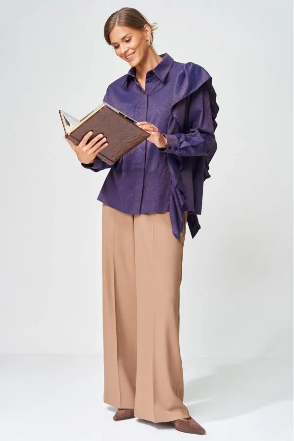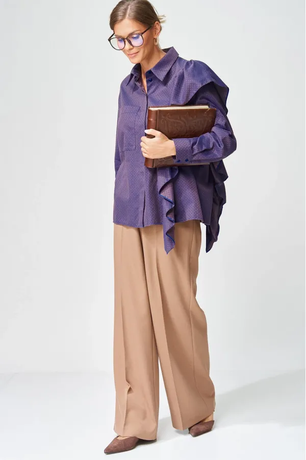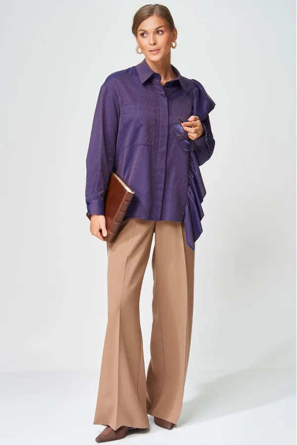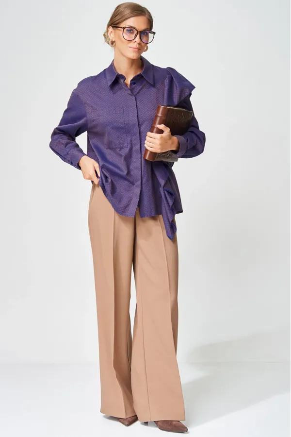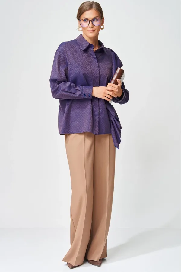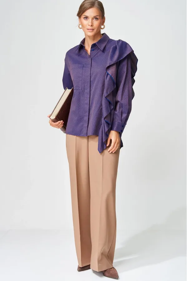 Костюм состоит из блузки (рубашки) и брюк. Рубашка прямого силуэта выполнена из хлопковой ткани с оригинальным жаккардовым переплетением. Перед с центральной застежкой потайной планкой. Левая часть переда и спинка с воланом на сборке вставленном в рельеф. На правой части переда настрочен карман. Рукав втачной одношовный с манжетой по низу, на манжете застежка на 2 петли и пуговицы. Воротник отложной со стойкой. Брюки расширеные книзу с притачным поясом выполнены из костюмной ткани. В поясе по бокам вставлена резинка. По передней и задней частям брюк вытачки и заутюжены стрелки. Спереди застежка гульфик на молнии и пуговицей на поясе. Фурнитура может быть изменена с сохранением художественного образа. Длина рубашки - 65 см, длина рукавав рубашки - 53 см. Длина брюк по боковому шву без учета пояса- 106 см.