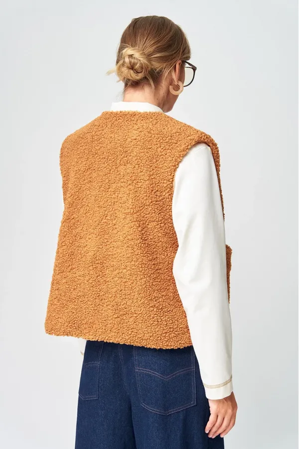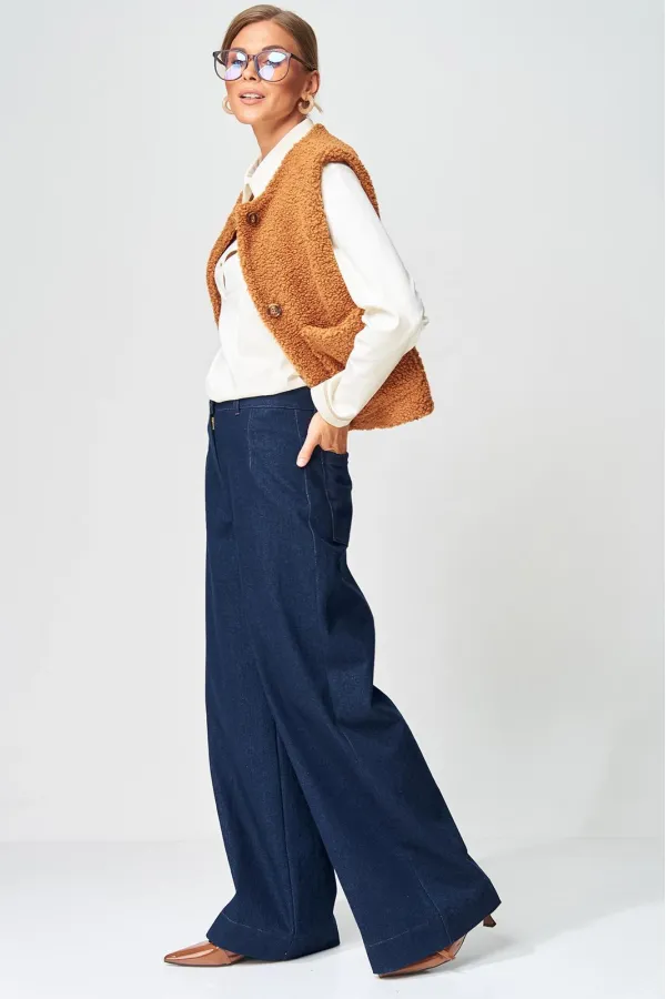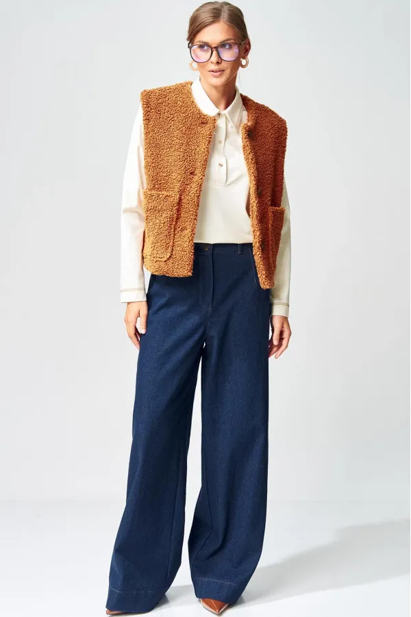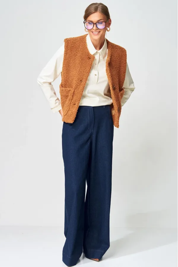 Жилет прямого свободного силуэта из теплой ткани барашек. Перед с настрочными карманами. Застежка на 3 петли и пуговицы. Жилет на подкладке. Брюки расширеные книзу на притачном поясе из джинсовой хлопковой ткани. По пояс... Читать далее...
