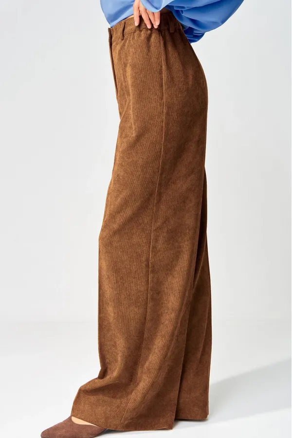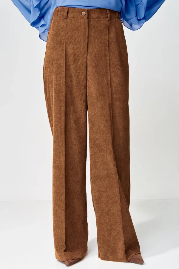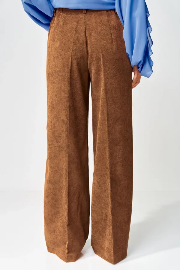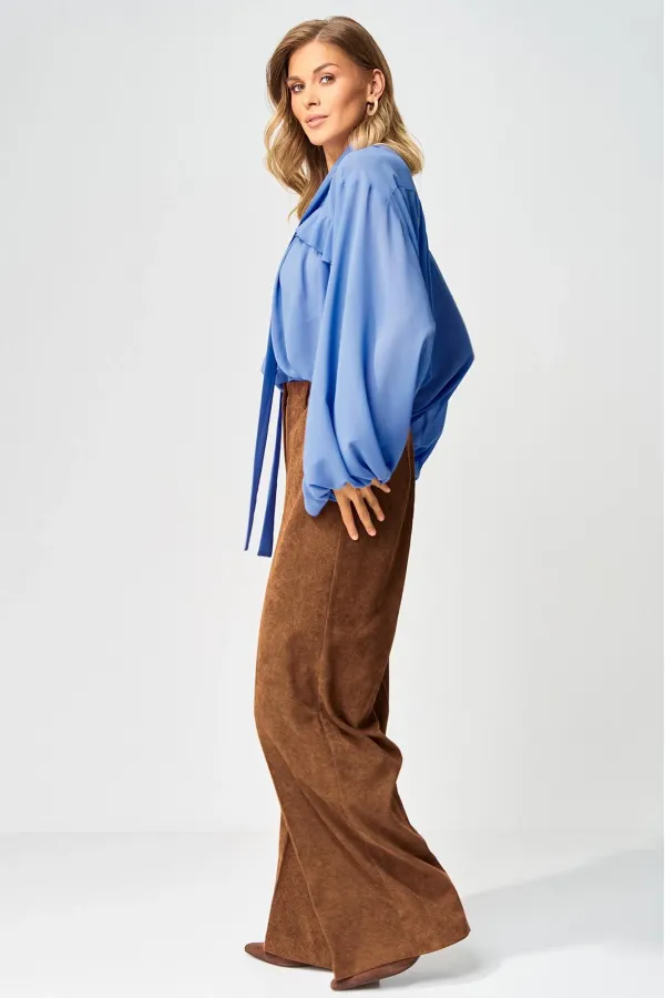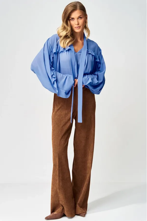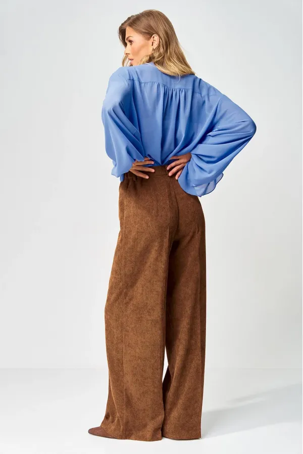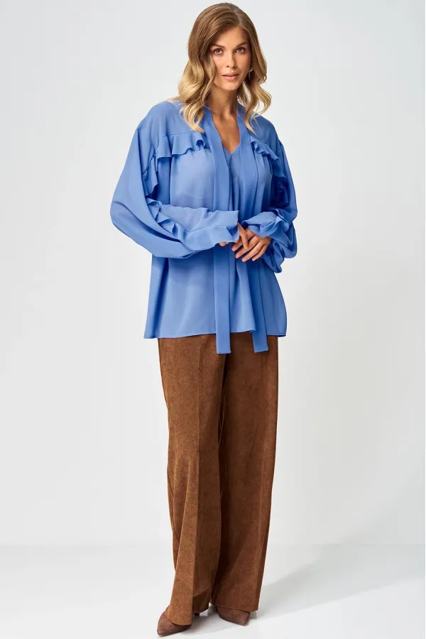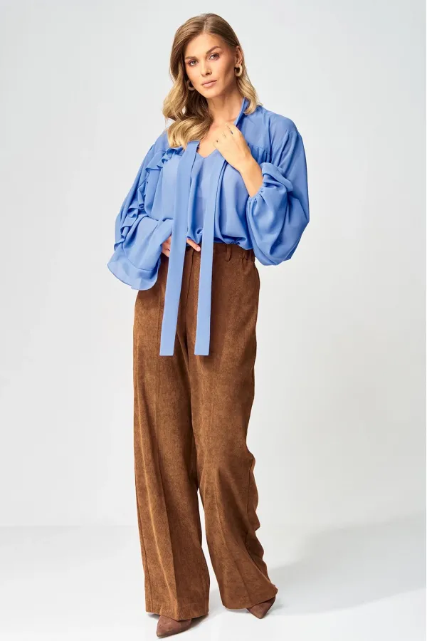 Блузка свободного силуэта из струящейся шифоновой ткани. Перед и спинка с кокеткой и сборкой. Рукав спущенный свободный с резинкой понизу. Вдоль линии кокетки и рукава вставлена рюша. Горловина V-образной формы с воротником стойкой переходящей в бант. Брюки палаццо с притачным поясом из мягкой вельветовой ткани. Спереди застежка гульфик на молнии и петлей и пуговицей по поясу. По задней частям брюк вытачки. Пояс с резинкой в боковых частях. Брюки с заутюженными стрелками. Длина блузки - см, длина рукава - см. Длина брюк с учетом пояса - 109 см.