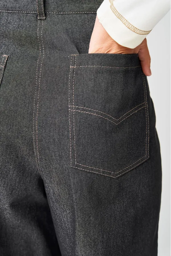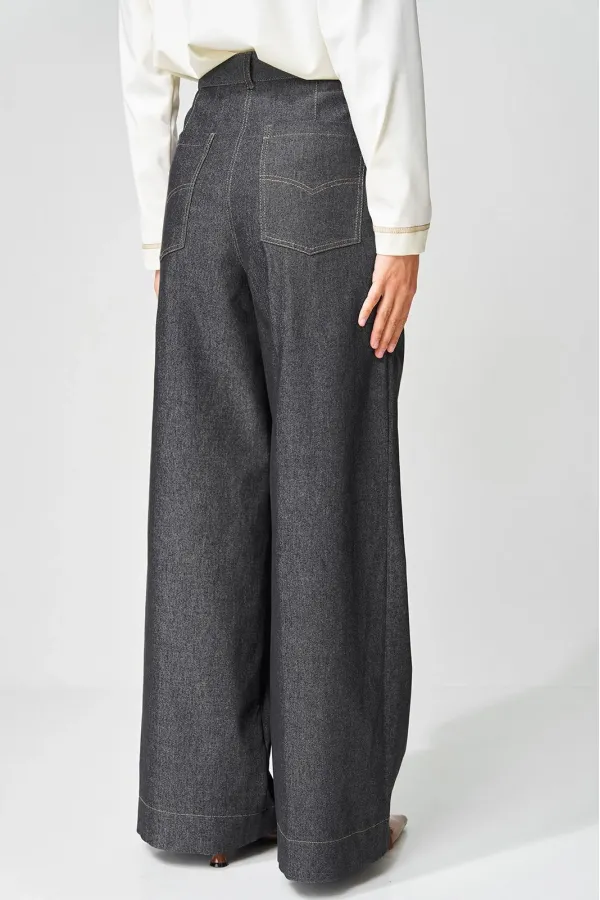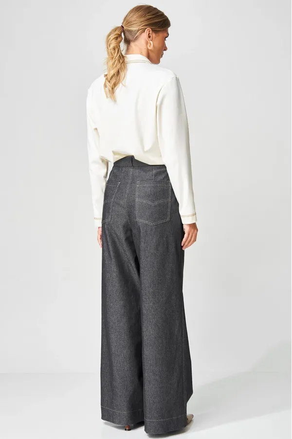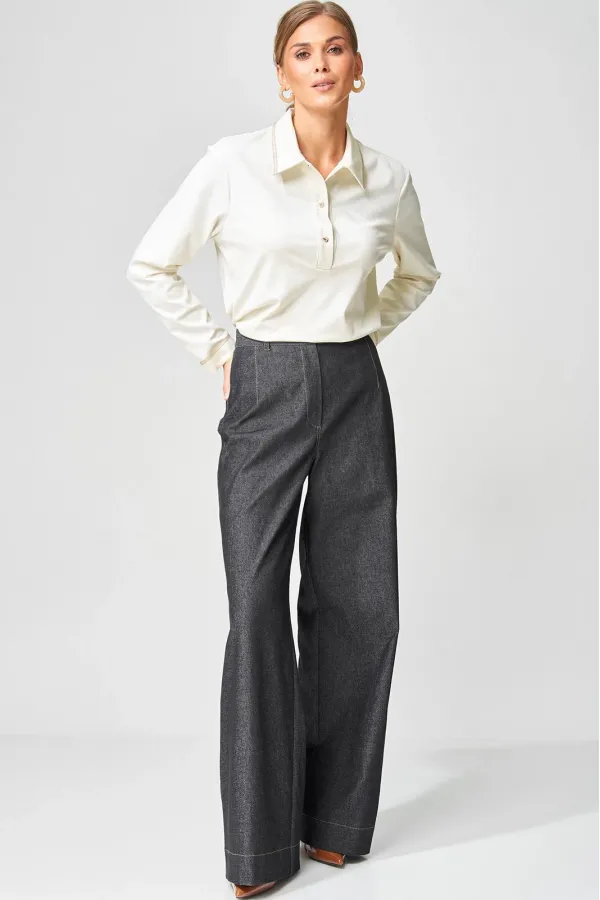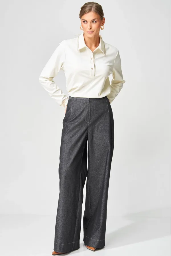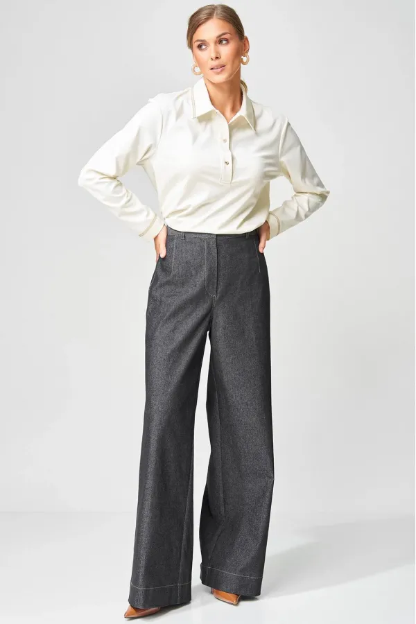 Джемпер прямого силуэта с воротником поло из плотной хлопковой ткани двухнитка. Рукав втачной одношовный. По низу изделия, по низу рукава и по воротнику проложена отделочная строчка. Брюки расширеные книзу на притачном п... Читать далее...