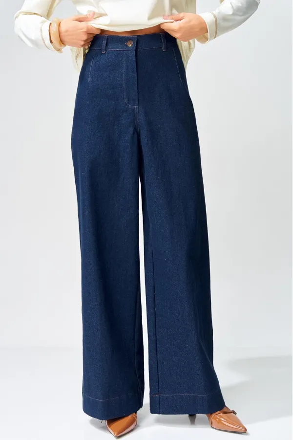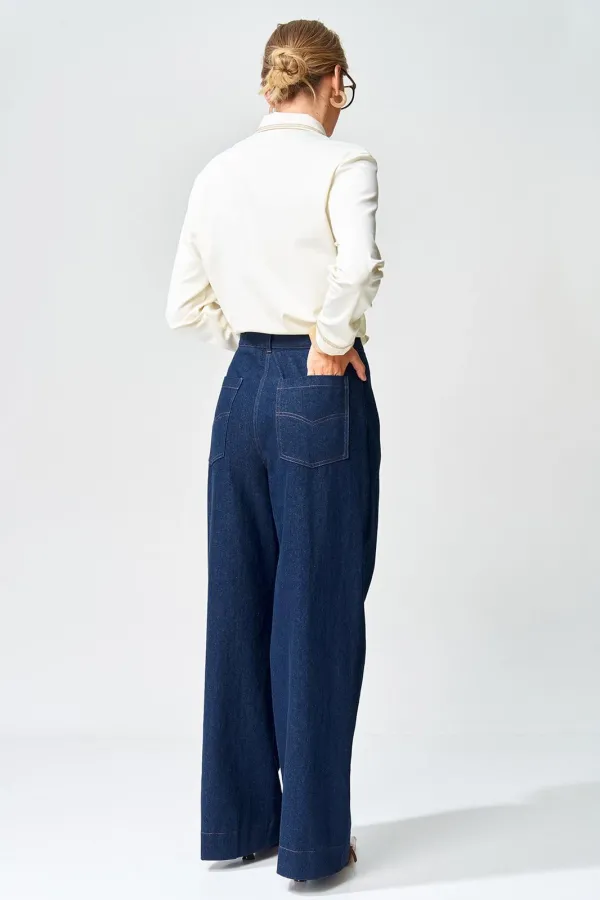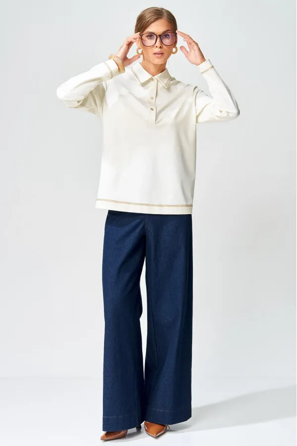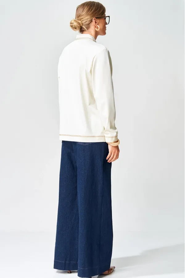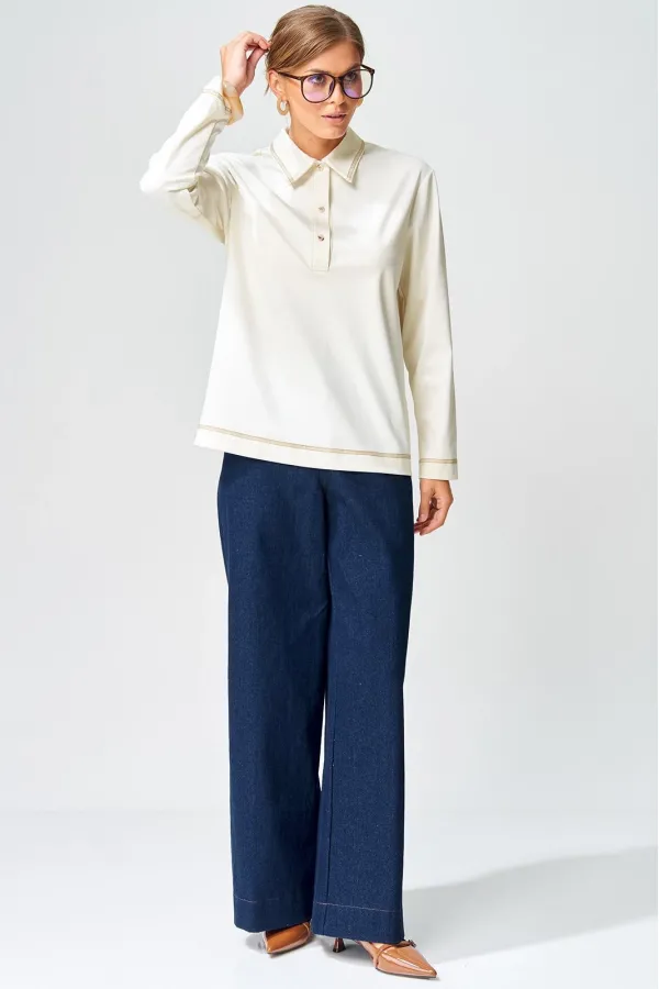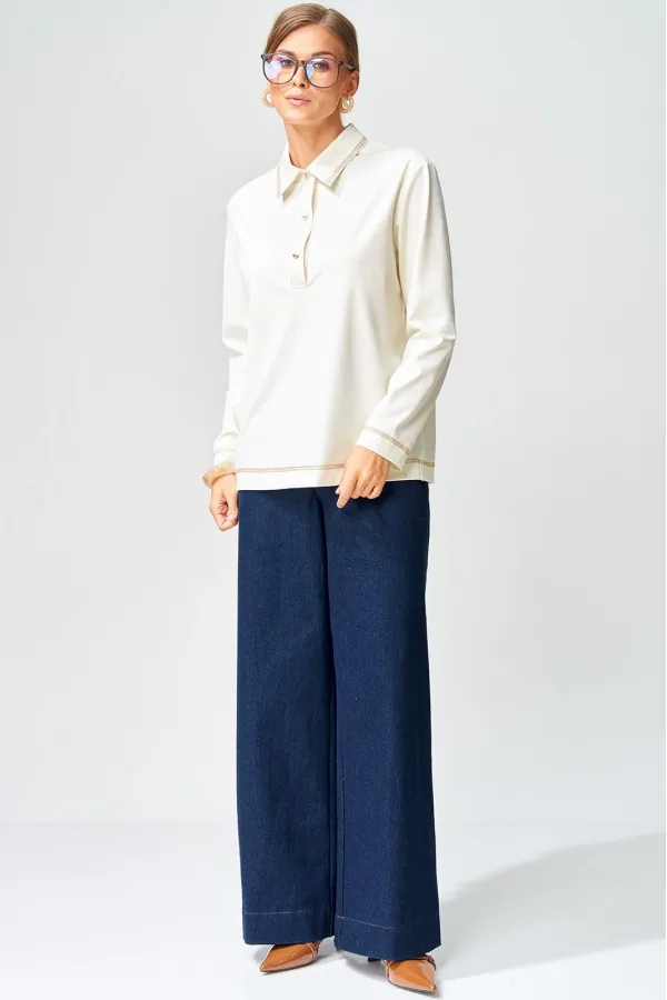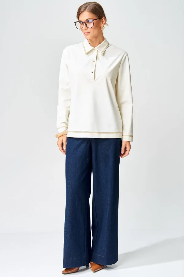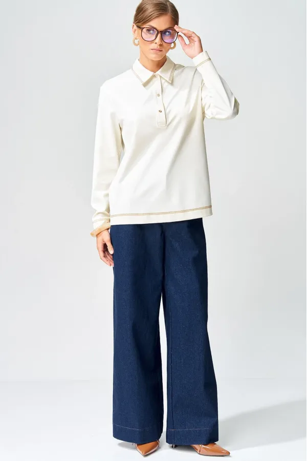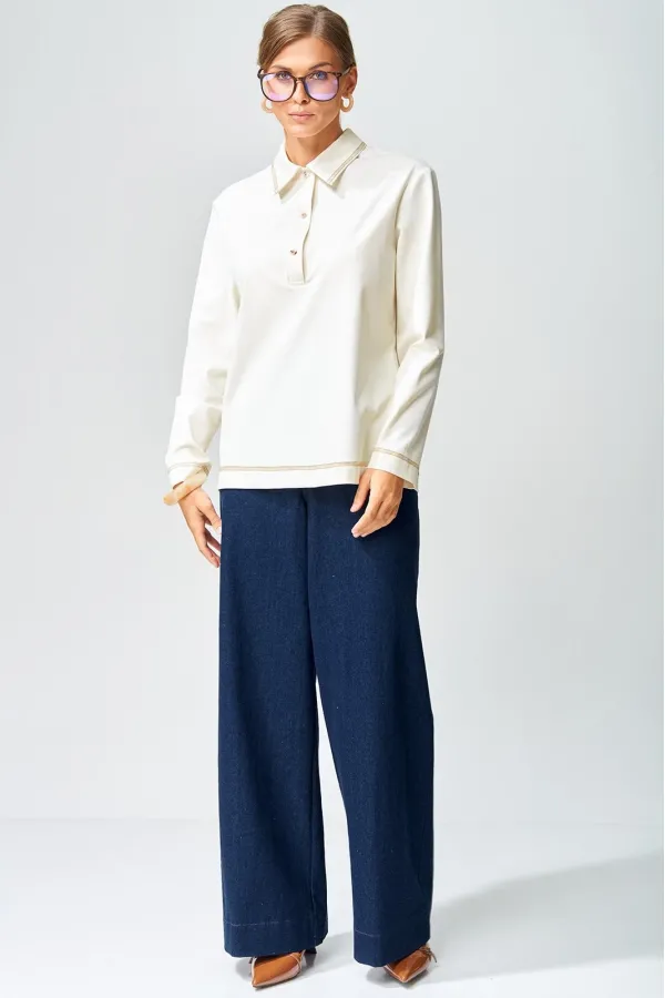 Джемпер прямого силуэта с воротником поло из плотной хлопковой ткани двухнитка. Рукав втачной одношовный. По низу изделия, по низу рукава и по воротнику проложена отделочная строчка. Брюки расширеные книзу на притачном п... Читать далее...