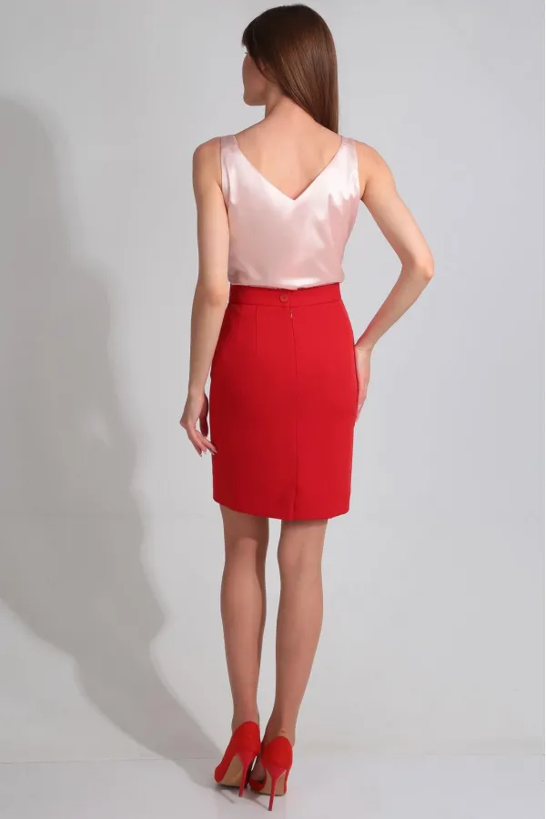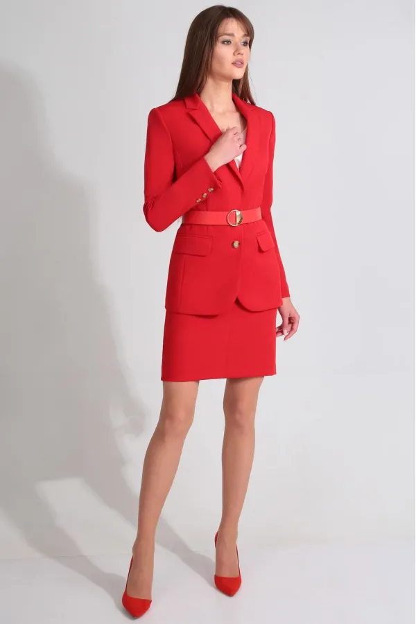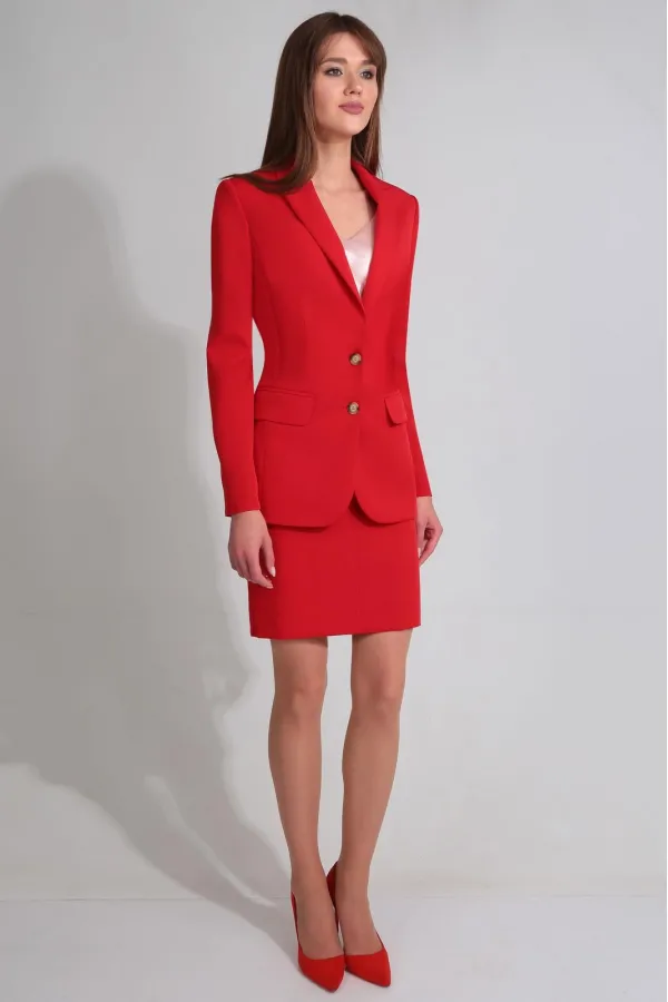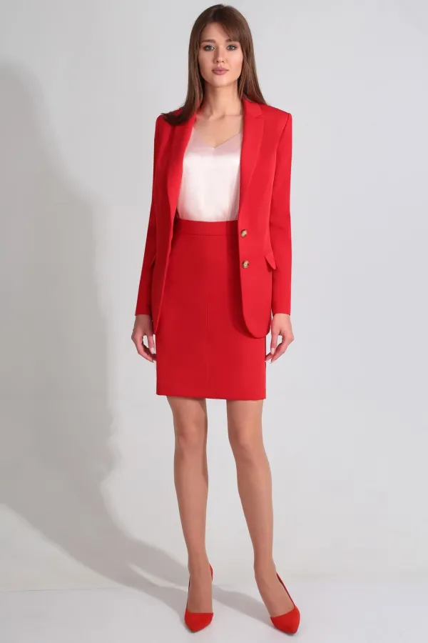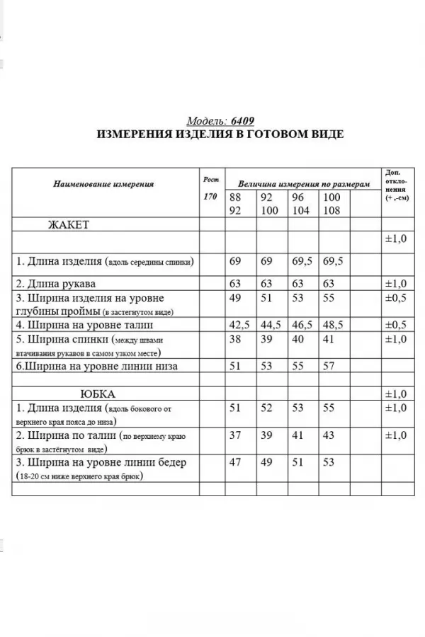 Описание внешнего вида: жакет с втачным воротником и лацканами пиджачного типа, центральной застежкой на петли и пуговицы. По переду с рельефами, выходящими из проймы и талиевыми вытачками. На уровне линии бедер расположены прорезные карманы с клапаном и двумя обтачками. Спинка со средним швом, рельефами, выходящими из проймы. Жакет со съемным поясом. Юбка с отрезным поясом, застежкой на потайную молнию в среднем шве заднего полотнища. Переднее полотнище со средним швом. Заднее полотнище со средним швом, заканчивающимся шлицей, талиевыми вытачками.