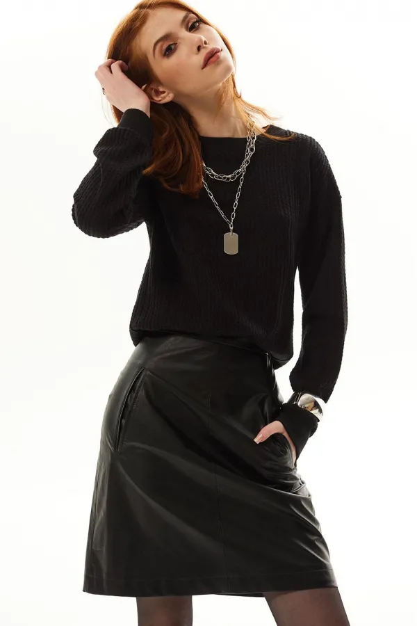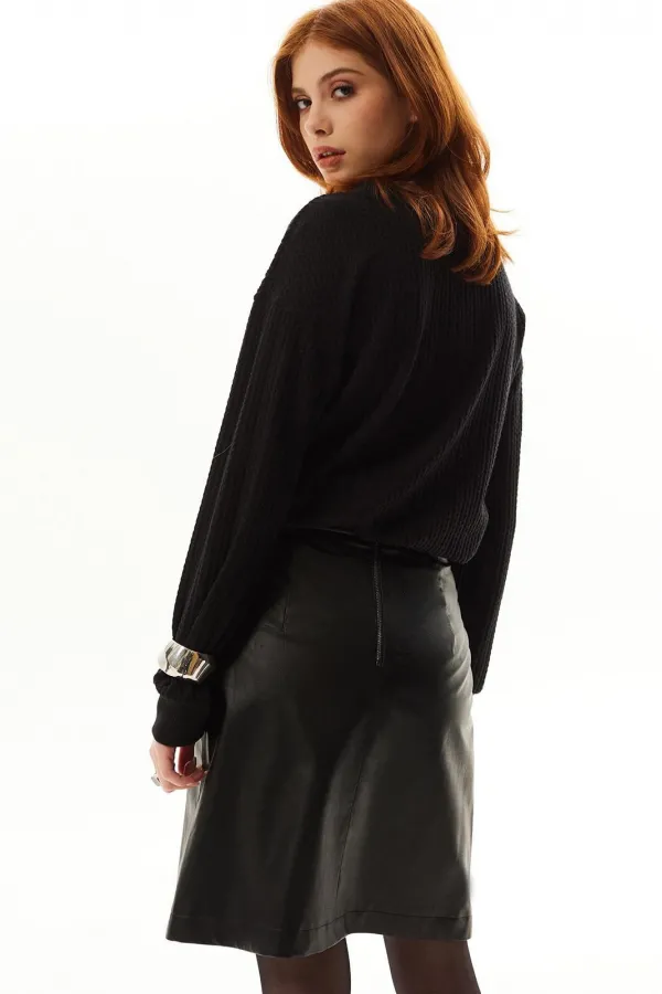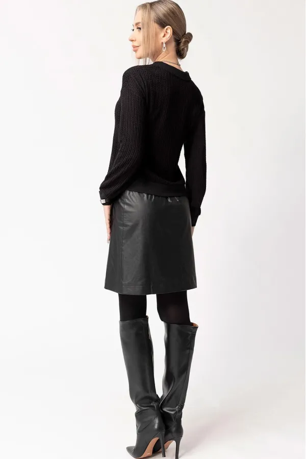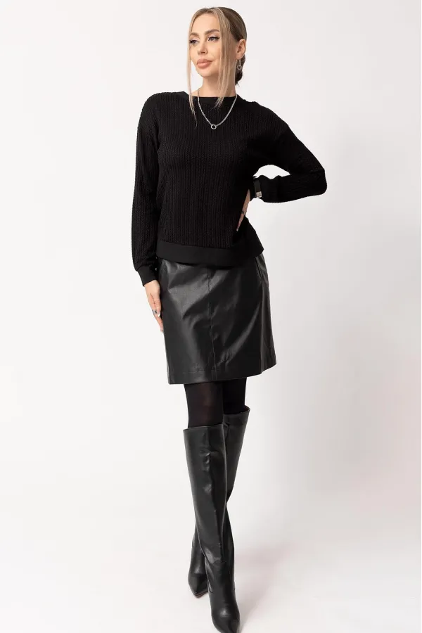 Блузон: полиэстер 60% вискоза 36% эластан 4% (трикотаж). Юбка: эко кожа на хлопковой подкладке.