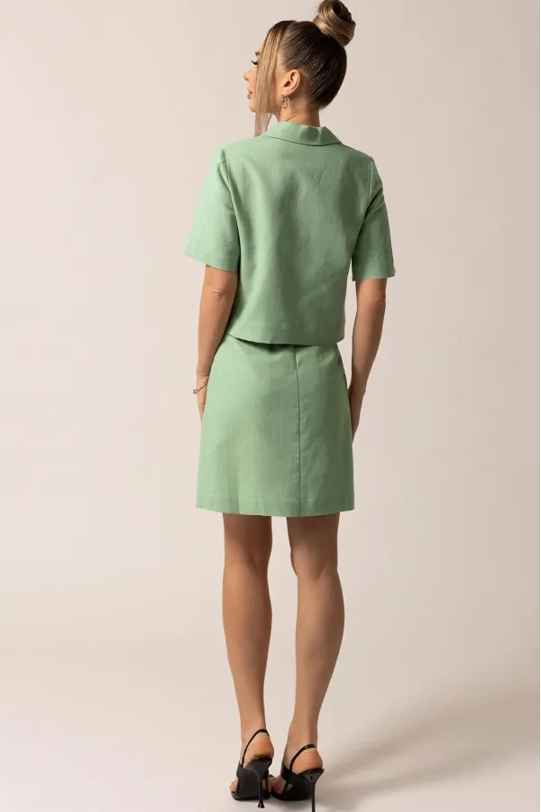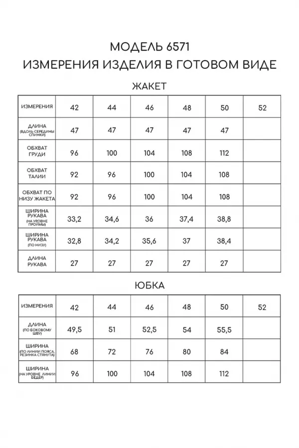 Жакет с центральной застежкой на петли и пуговицы, с втачным воротником и отложными лацканами. По переду нагрудными вытачками. Спинка цельная. Рукав втачной, короткий. Юбка с отрезным поясом. На поясе расположены шлевки. В области спинки пояс присборен на резинку. Застежка на потайную молнию в левом боковом шве. Заднее полотнище со средним швом. Юбка со съёмным поясом.