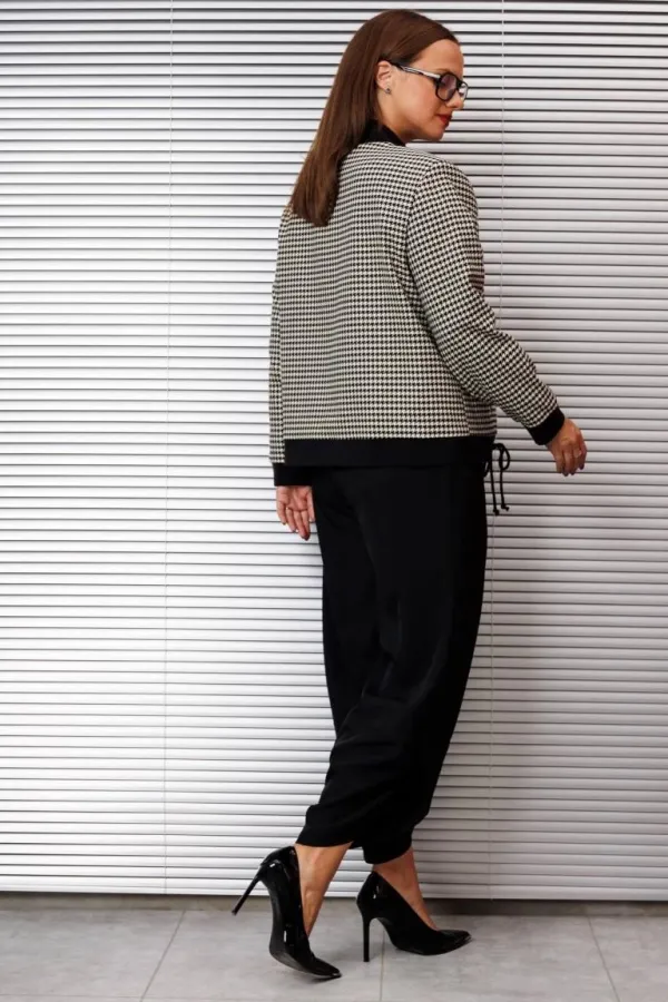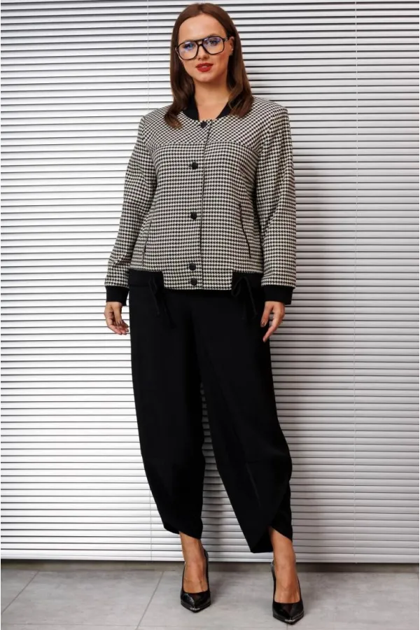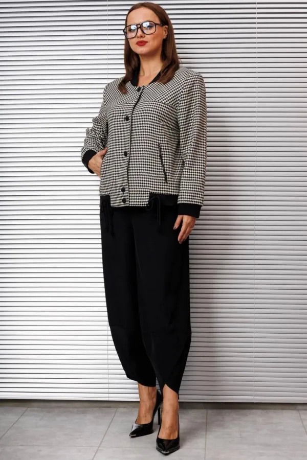 Комплект женский состоящий из бомбера и брюк.Бомбер свободного силуэта, вырез горловины округлый с довязом, рукав втачной на манжете из резинки по низу. По переду бомбера кокетка и карманы на молнии. Застежка на петли и ... Читать далее...