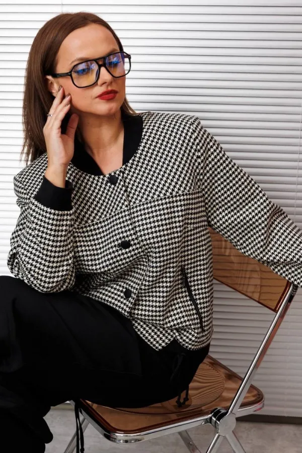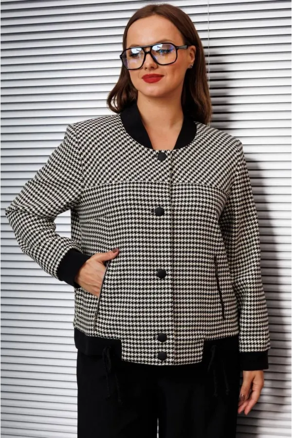 Бомбер свободного силуэта, вырез горловины округлый с довязом, рукав втачной на манжете из резинки по низу. По переду бомбера кокетка и карманы на молнии. Застежка на петли и пуговицы. Бомбер на подкладке.