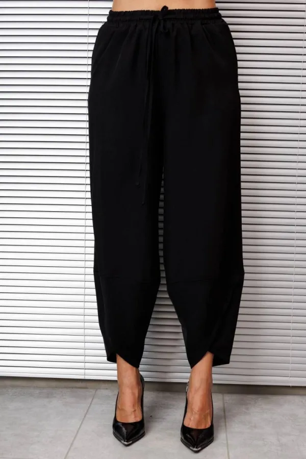 Брюки «бананы». По талии на резинке, без застежки. В боковых швах карманы. По низу отрезная деталь с запахом.