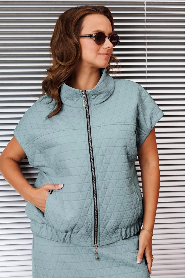 Жилет свободного силуэта, вырез горловины со стойкой, без рукава, по переду карманы в шве рельефа. По низу изделие на резинке, застежка на тесьму-молнию. Жилет на подкладке.