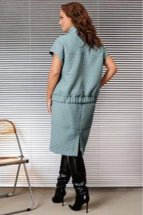 Костюм состоящий из жилета и юбки.Жилет свободного силуэта, вырез горловины со стойкой, без рукава, по переду карманы в шве рельефа. По низу изделие на резинке, застежка на тесьму-молнию. Жилет на подкладке.Юбка зауженна... Читать далее...