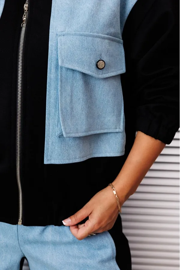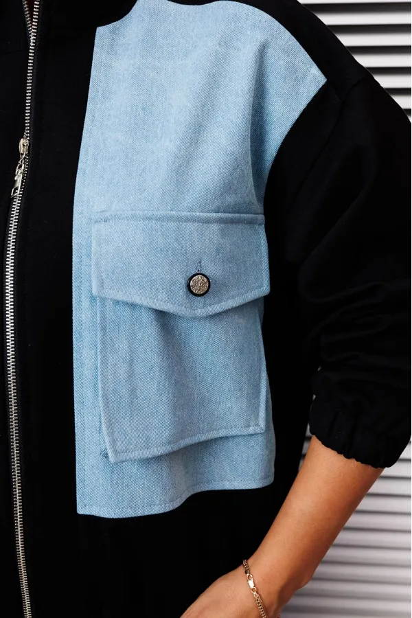 Бомбер свободного силуэта на резинке по низу, вырез горловины со стойкой. Рукав спущенный, длинный на резинке внизу. Бомбер комбинированный из двух тканей. Без подкладки. По переду накладные карманы-портфель.