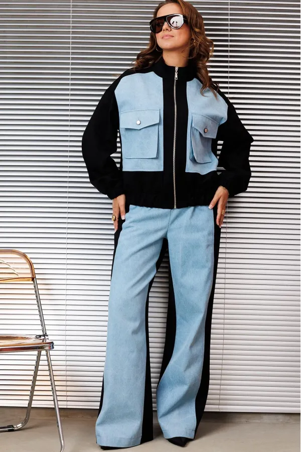 Комплект женский состоящий из бомбера и брюк. Бомбер свободного силуэта на резинке по низу, вырез горловины со стойкой. Рукав спущенный, длинный на резинке внизу. Бомбер комбинированный из двух тканей. Без подкладки. По ... Читать далее...