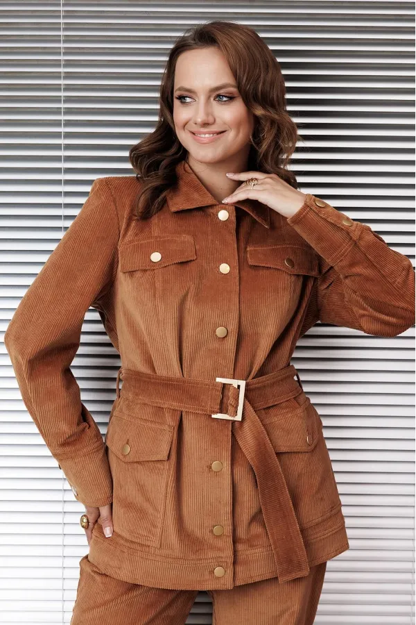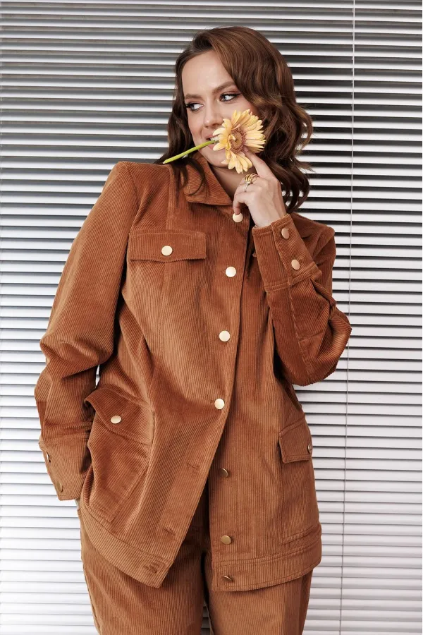 Жакет полуприлегающего силуэта, горловина с рубашечным воротником. Рукав втачной, длинный на манжете. По переду рельефы и накладные карманы с клапаном. Застежка по переду на петли и пуговицы.