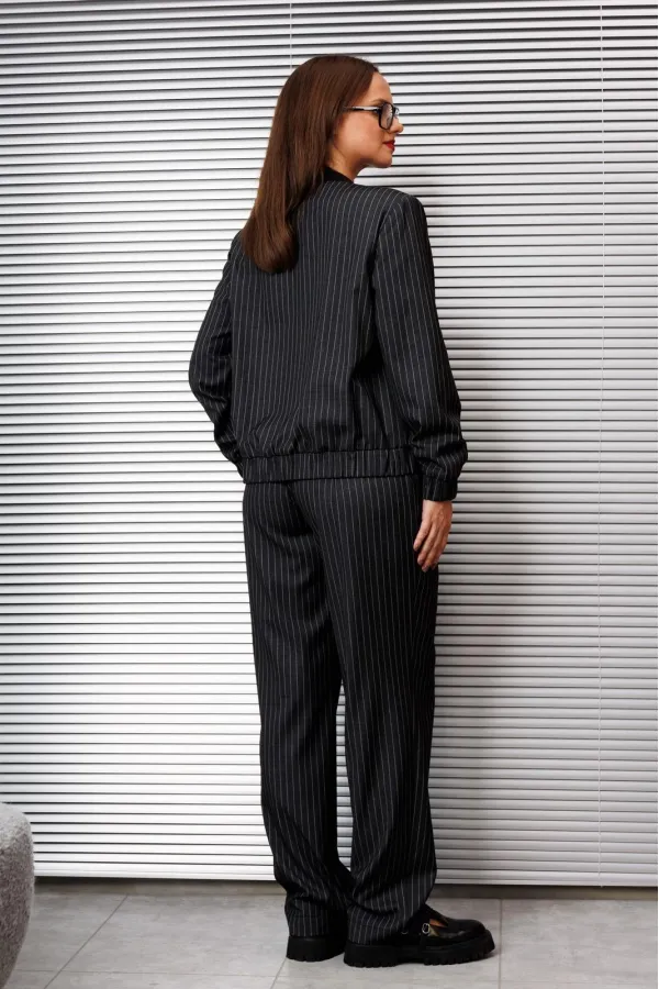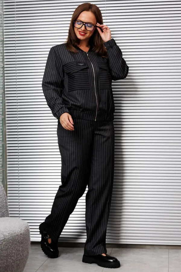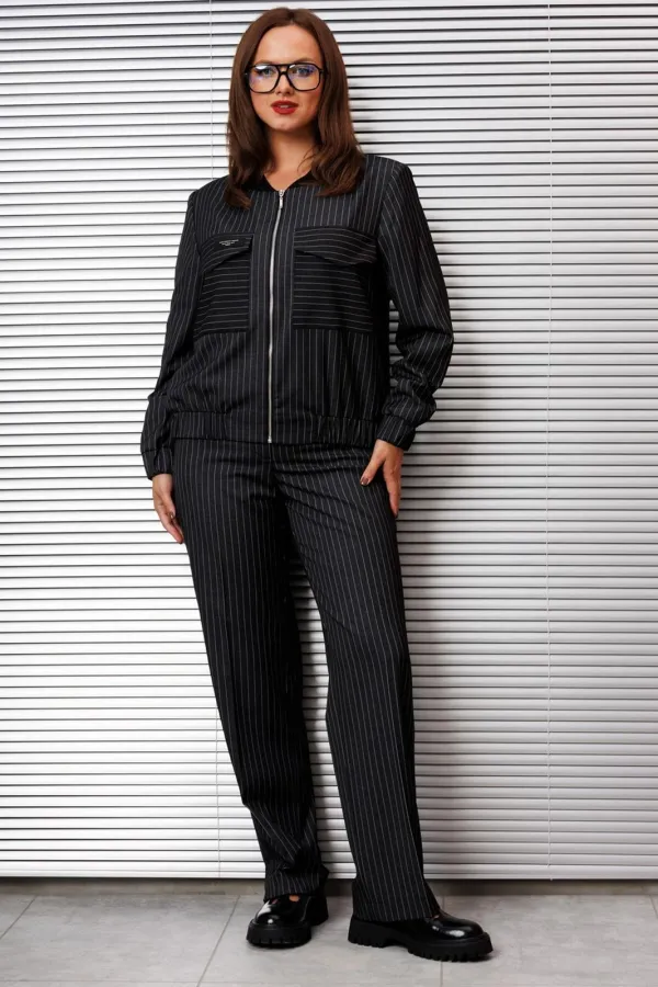 Комплект женский состоит из бомбера и брюк.Бомбер свободного силуэта, вырез горловины округлый. Рукав спущенный, длинный, внизу на на манжете. Нагрудные , накладные карманы с клапанами. Застежка на тесьму-молнию на всю д... Читать далее...