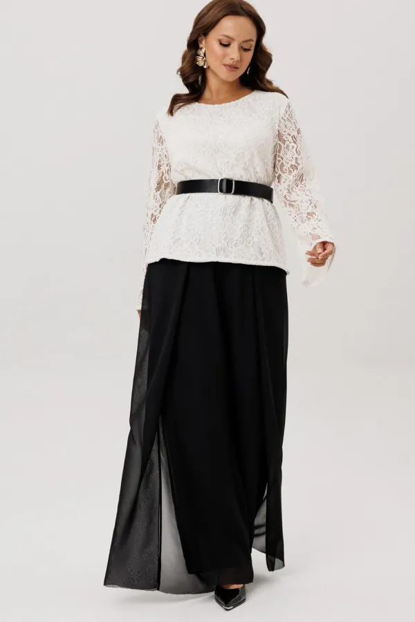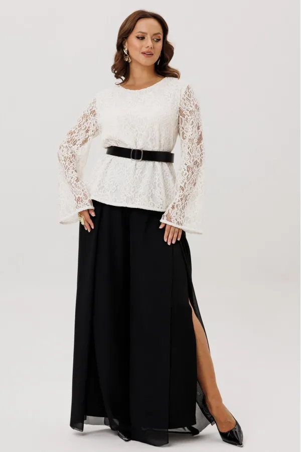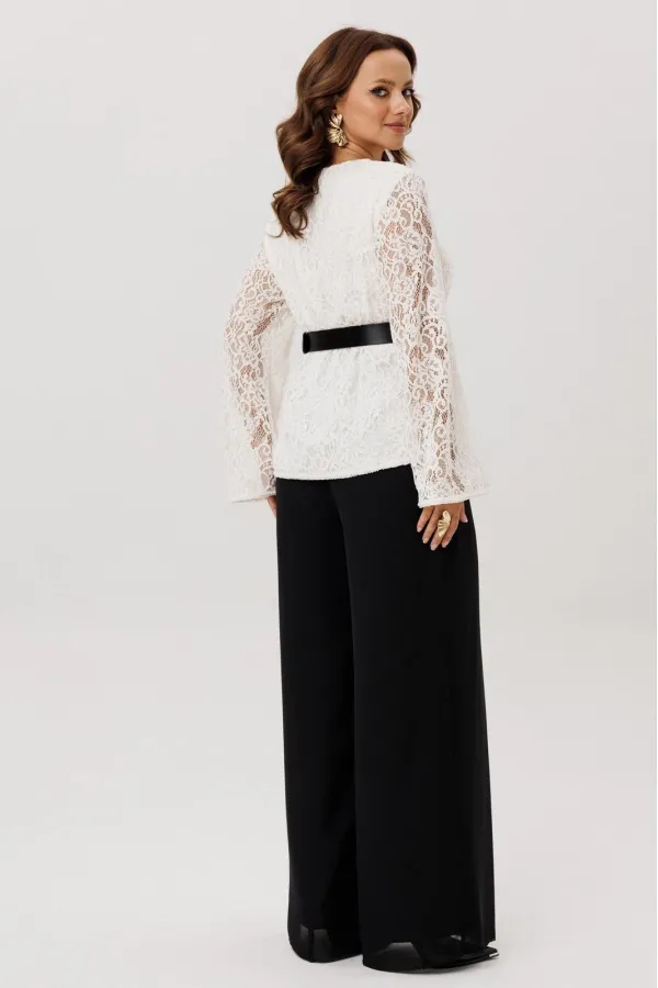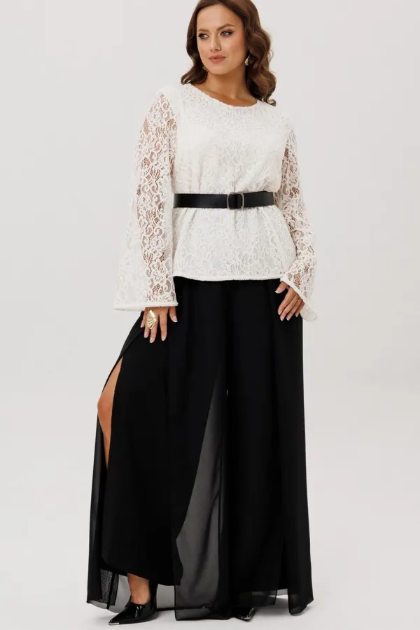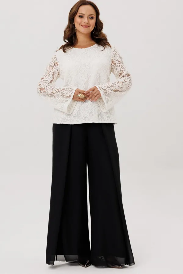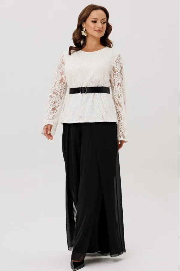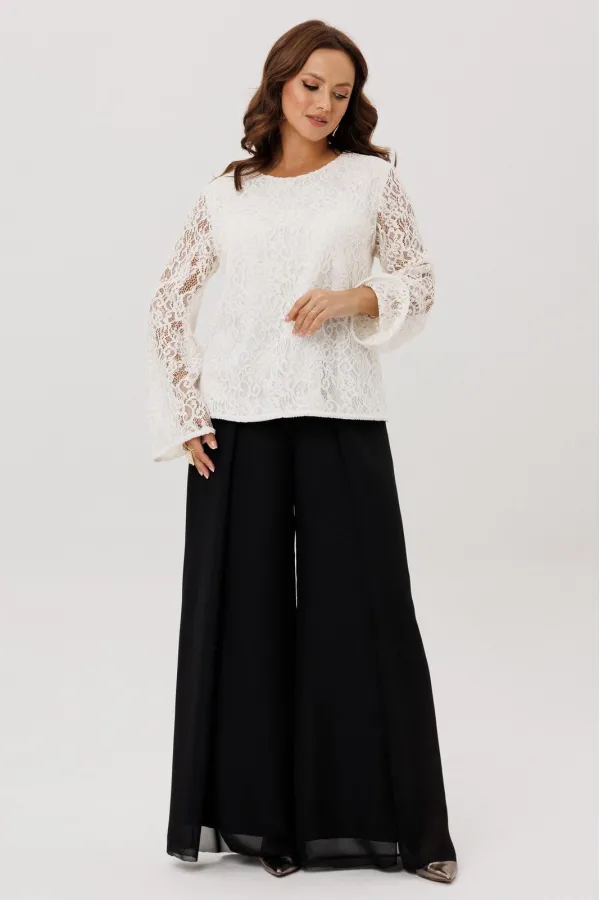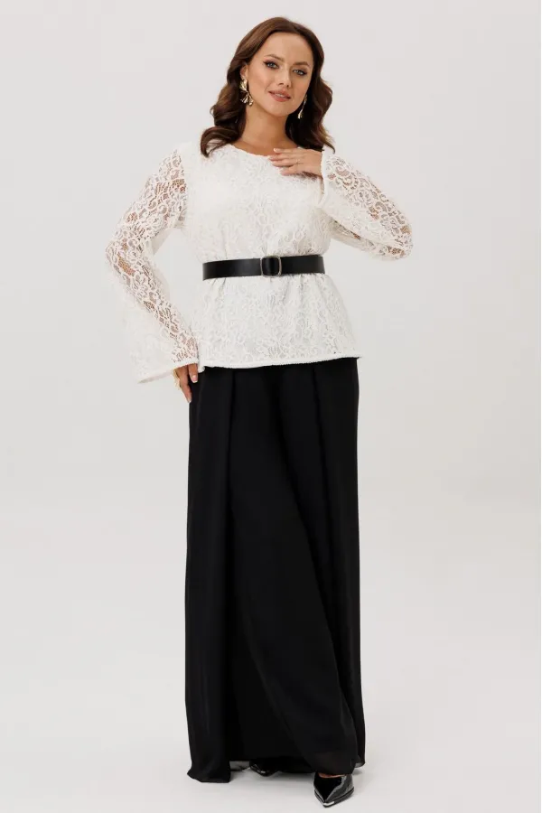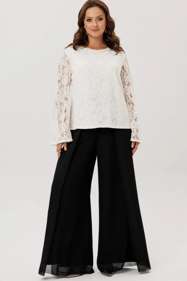 Комплект двойка состоящий из блузки и брюк.Блузка полуприлегающего силуэта, вырез горловины округлый, рукав втачной-клеш. Изделие на подкладке, без застежки.Брюки -палаццо двойные. По талии на резинке, по переду складки ... Читать далее...
