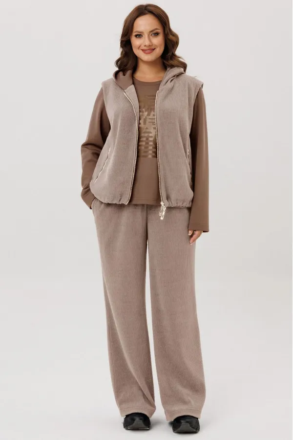 Комплект тройка состоящий из жилета, джемпера и брюк.Жилет свободного силуэта с капюшоном, без рукавов. По переду карманы на молнии, по низу на кулисе-резинке.. Застежка на тесьму-молнию по переду. Джемпер с округлым выр... Читать далее...